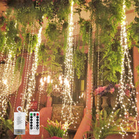4 Pack 880 Led Battery Operated Firefly Bunch Lights, Remote Control Timer 8 Flashing Modes Copper Wire Waterfall Lights, Fairy Lights Waterproof For Christmas Patio Party Outdoor Decor (Warm White)