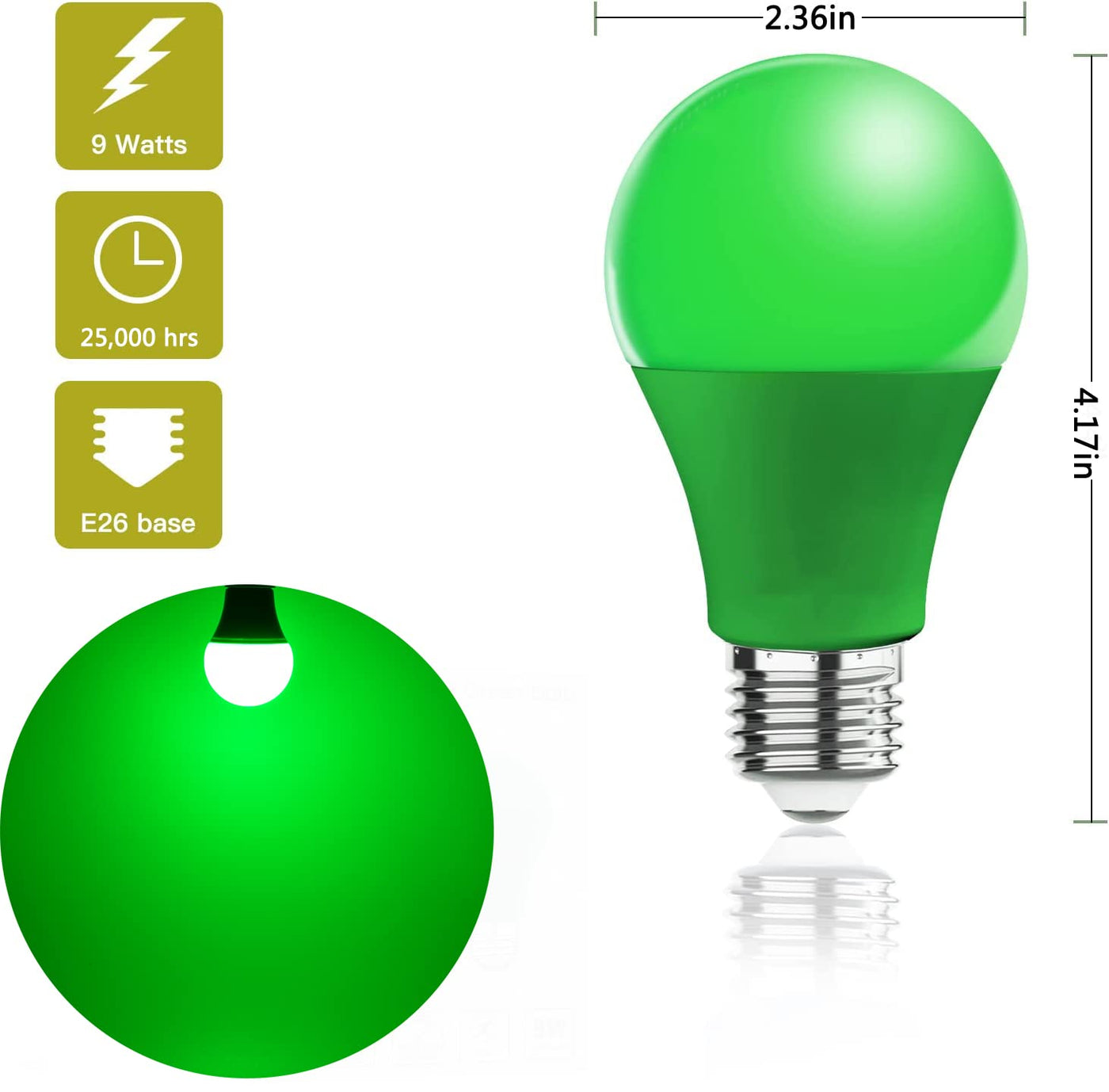 Vibrant-Colored Bulbs Replace that boring white light with a Green Bulbs LED A19 Colored Light Bulb instead. This bulb will add a beautiful touch of color to any indoor or outdoor setting. It’s the perfect choice when decorating for a party, holiday or special occasion, creating a soothing yet charming glow that’s sure to impress your guests. True Color Chips Green light will create the perfect atmosphere in your dining room, bedroom or den. It’s also a great option for use as a nightlight or to keep a hallway lit in case you wake up in the middle of the night. Unlike other green bulbs on the market, this one features true green LED chips to deliver a durable, bright light source with vibrant color – producing the perfect ambiance and illumination for any occasion. Less Energy, Longer Life Each low, 9-wattage bulb (60-watt equivalent) emits a 900-lumen colored light, yet uses less energy and endures for longer periods of time. In fact, each bulb can last up to 25,000 hours, providing you with decorative lighting and relaxing nights for years to come. Great replacements for incandescent a19 bulbs, you will not only see a reduction in your electric bill, but these light bulbs are virtually maintenance free. Perfect Illumination Green light will create the perfect atmosphere in your bedroom or den. It’s also a great option for use as a nightlight or to keep a hallway dimly lit in case you wake up in the middle of the night. Unlike other green bulbs on the market, produce the perfect ambiance and provide the right amount of illumination you need. Colored Bulbs for a Vibrant Lifestyle Use It Anywhere Furnished with a standard e26 LED base, the LED A19 Colored Light Bulb will fit most lighting fixtures so you can transform virtually any room into a relaxing colored hue. They’re the perfect choices for illuminating your outdoor porch or deck, or for decorative illumination, holiday lighting and party decorating. No Hazardous Gases Offering outstanding energy efficiency and enjoyable colored illumination in one package, this 4-pack of LED A19 Colored Light Bulbs is a must-have. Furthermore, LED bulbs are a safer alternative. They are free of harmful mercury and won't release any hazardous gases, creating a healthy environment for you and your family. Plus, there’s no need to worry if a bulb breaks or about having to recycle it. High Performance & Energy Saving A19 LED Green light bulbs deliver 150-degree light output. Used High Lumen Led Chips replace to 100w traditional light bulb, and power consumption, energy saving over 85%. Easy to Install E26 Base fits all standard E26 sockets. No necessary to find other fixture to fit this bulb. Easy install to E26 socket. Wide Application Colored light bulbs perfect for help reduce stress, creating comfortable atmosphere in your bedroom. This must a best option for use as a nightlight or to keep a hallway lit when you wake up in the middle of the night. Specification Color: Green Voltage : 90-265V CRI: >80Ra (vivid and natural light) Light Source:LED Lifetime: 25000 hours Socket: E26 Medium Screw Base Size: F60*106mm (2.36in*4.17in) Power: 9W (100W Equivalent) Material: Aluminum and Plastics Luminous Intensity: 900LM (High lumen efficiency) Dimmable: NO Features: Festival Decorative Lighting Mood Light Bulb Holiday/Party Lighting What's include: 4 x LED Green Light Bulbs