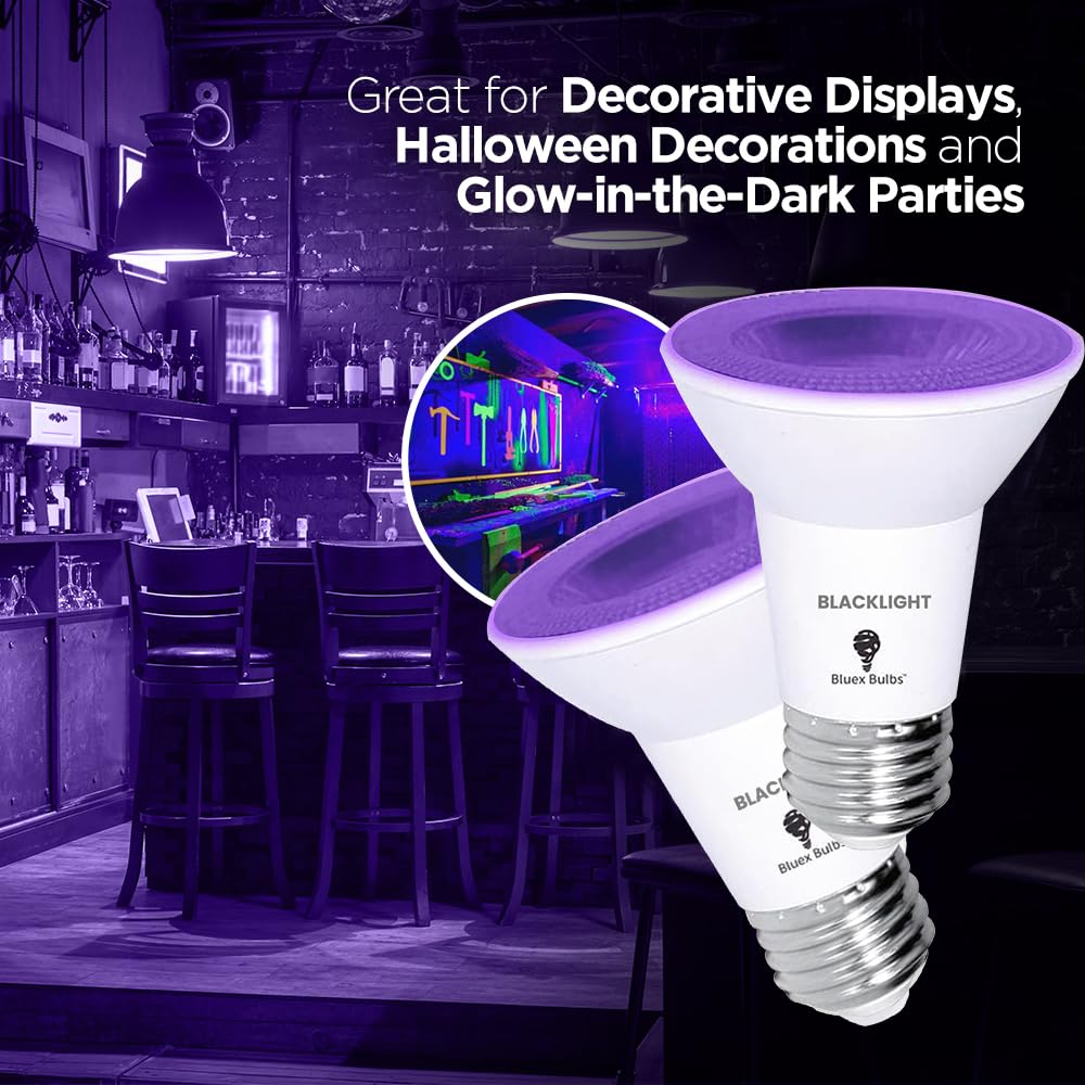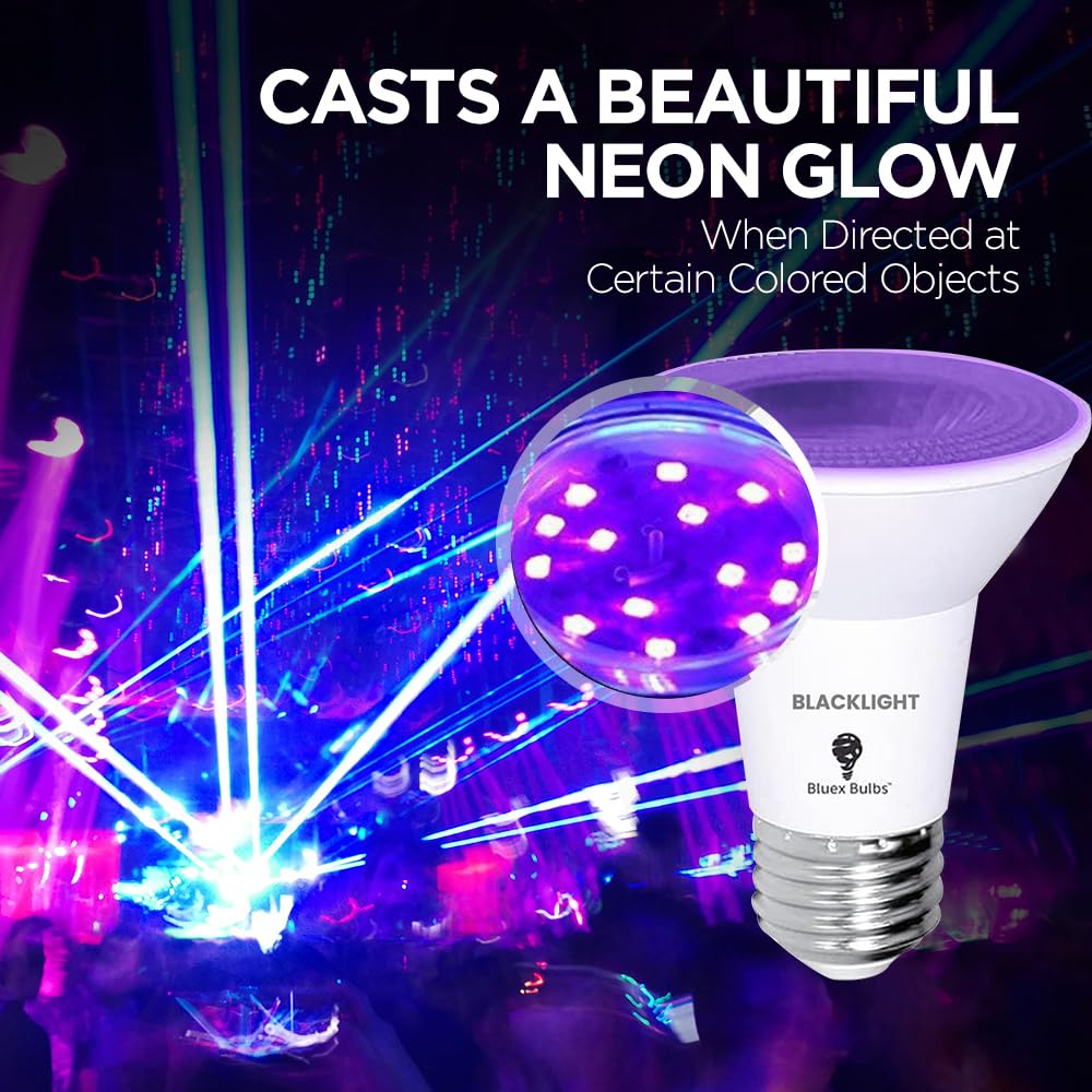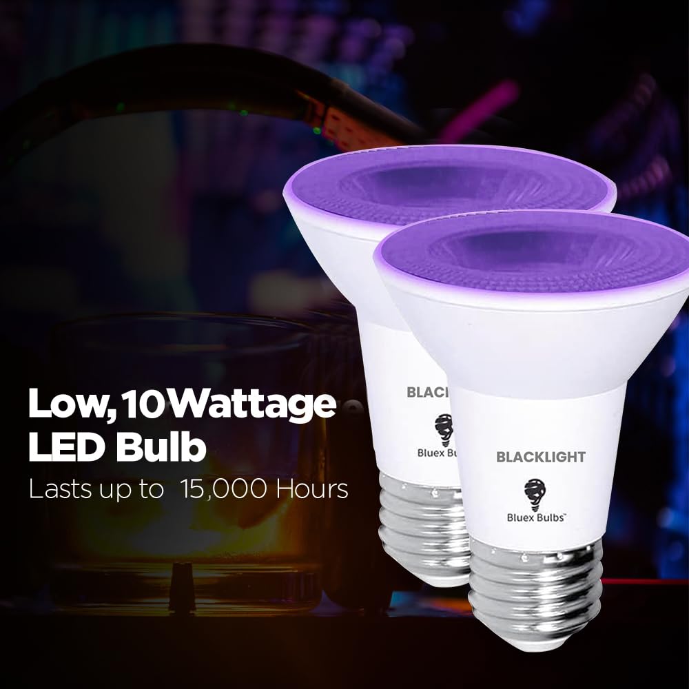 Liven up the party or decorate for the holidays using Bluex Bulbs LED Light Bulb Blacks. Using approximately 85% less energy than traditional incandescent bulbs, this low, 16 Watt LED Light bulb allows you to enjoy decorative lighting while cutting down on electricity costs. LED Black lights level bulb is the emission of ultraviolet light that isn’t visible to the human eye. However, when this light hits an object containing phosphors, it cause the surface to naturally fluoresce and cast a beautiful glow. Turning certain colored objects neon, it makes for an impressive light show and dramatic atmosphere. Create a spectacular Halloween display to spook trick-or-treaters, decorative glow 2k neon lighting for the holidays, or the perfect dance floor for weddings and other celebrations. These bulbs will totally change the vibe of any special gathering, turning a somewhat dull atmosphere into a spectacular light display. Even posters and white shirts will take on a whole new look on neon poster when illuminated. In addition to decorative lighting, these bulbs are great for readmission's into amusement parks, setting the scene in night clubs or bars, or helping to uncover evidence in forensic and arson investigations. They can also be used to authenticate oil paintings, antiques and gemstones, as well as provide pest control. Furnished with a standard e26 Blank base, the Safe LED Black light Bulb will fit most lighting fixtures so you can turn virtually any room into an entertaining party. Plus, the bulbs are sold in a to provide you with twice as much fun! Each bulbs can last up to 30,000 hours, providing you with decorative lighting and unforgettable nights for years to come.