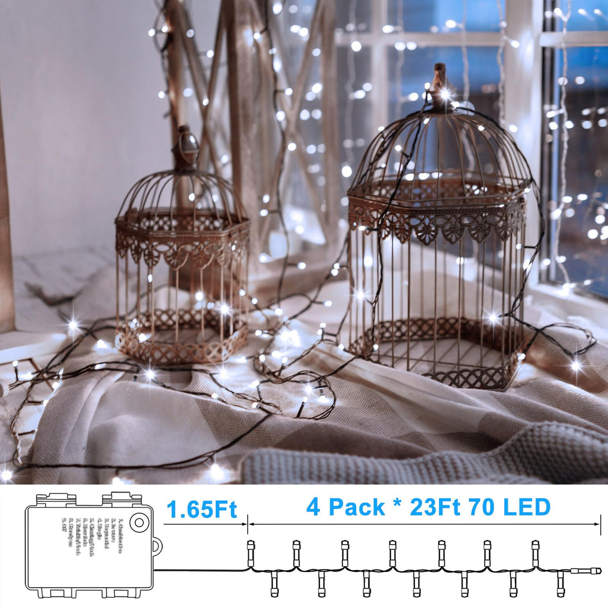 4 Pack String Lights Battery Operated, Each 23Ft 70 Led Christmas Lights With Timer 8 Modes Twinkle Fairy String Lights For Indoor Outdoor Wedding Garland Xmas Tree Decoration (Cool White) Specification: Size: 4 Pack X 23Ft 70 Led Power Source: 3 Aa Batteries (Not Supplied) Led Quantity: 4*70Led Strip Length: 4*23Ft Lead Length: 1.64Ft Waterproof Rate: Ip54 Auto Timer: 6 Hour On, 18 Hour Off, 24-Hour Cycle (Timer Enabled By Default, No Need To Set) 8 Modes: Combination/ Wave/ Sequence/ Slow/ Chase/ Flashing/ Slow Fade/ Flashing/ Flickering/ Steady On Package Content: 4 Pack*23Ft 70Led String Lights,1X Instructions *