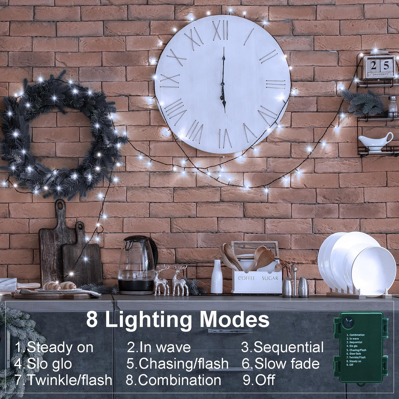 Q: What are the lighting modes available for these string lights?A: The string lights feature 8 different lighting modes: Combination, In wave, Sequential, Slo glo, Chasing/Flash, Slow fade, Twinkle/Flash, and Steady on, allowing you to create the perfect ambiance.