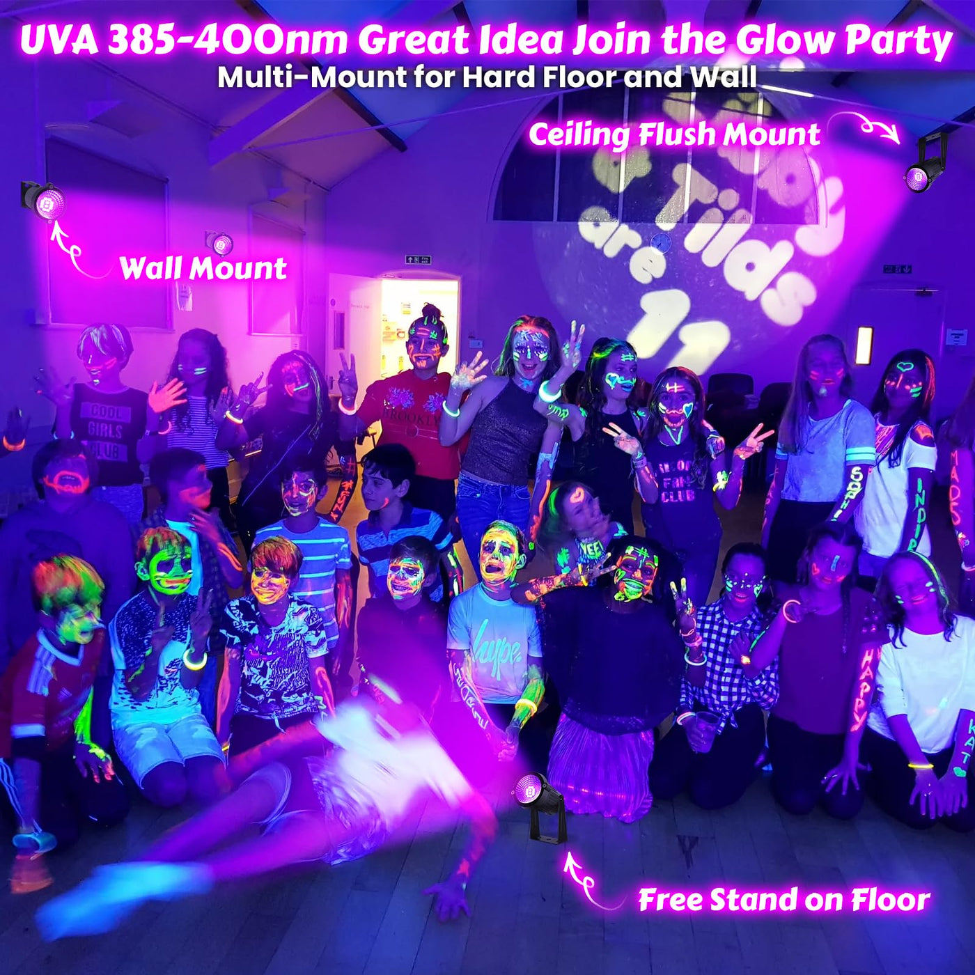 Q: Can these black lights be used for body paint and fluorescent posters?A: Yes, these black lights emit a safe wavelength of 385-400nm purple light, which is ideal for illuminating reactive pigments, body paint, fluorescent posters, and other neon-colored objects, enhancing their visibility in dark environments.