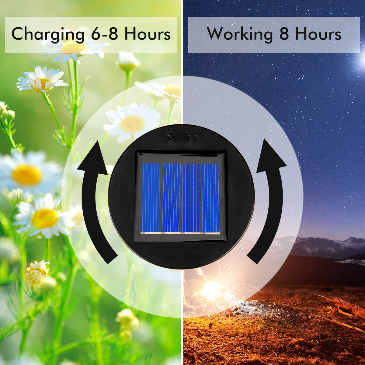 Q: How long does it take to charge the solar light tops and how long do they last?A: The solar light tops require approximately 6 to 8 hours of direct sunlight to fully charge. Once charged, they can provide warm light for about 8 hours at night, making them ideal for nighttime illumination.