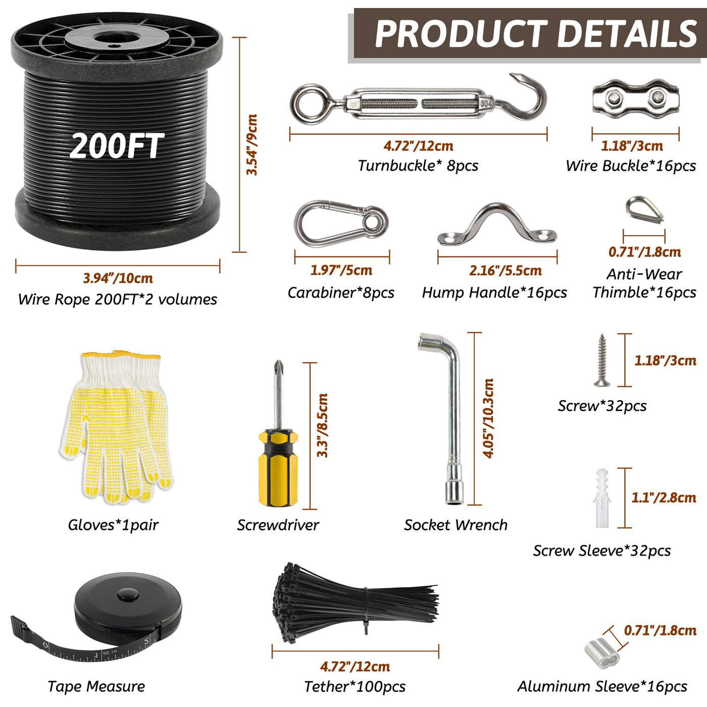 Package includes: 2 x 200FT String Light Hanging Kit 8 x Turnbuckles 8 x Snap Hooks 16 x Anti-wear thimble 16 x Hump Handle 16 x Rope Clamps 20 Aluminum Crimping Loop 32 x Screws 32 x Expansion Pipe 100 x Zip Ties 1 x Wrench 1 x Screwdriver 1x Tape Measure 1x Gloves