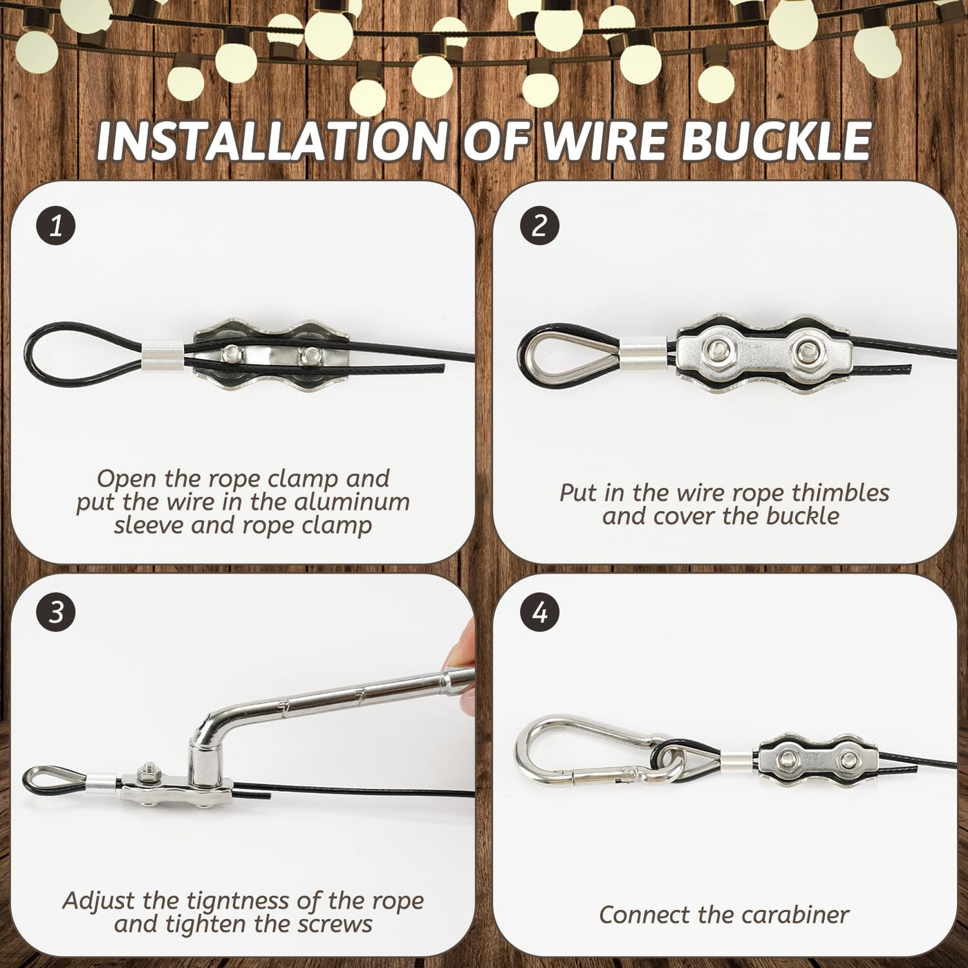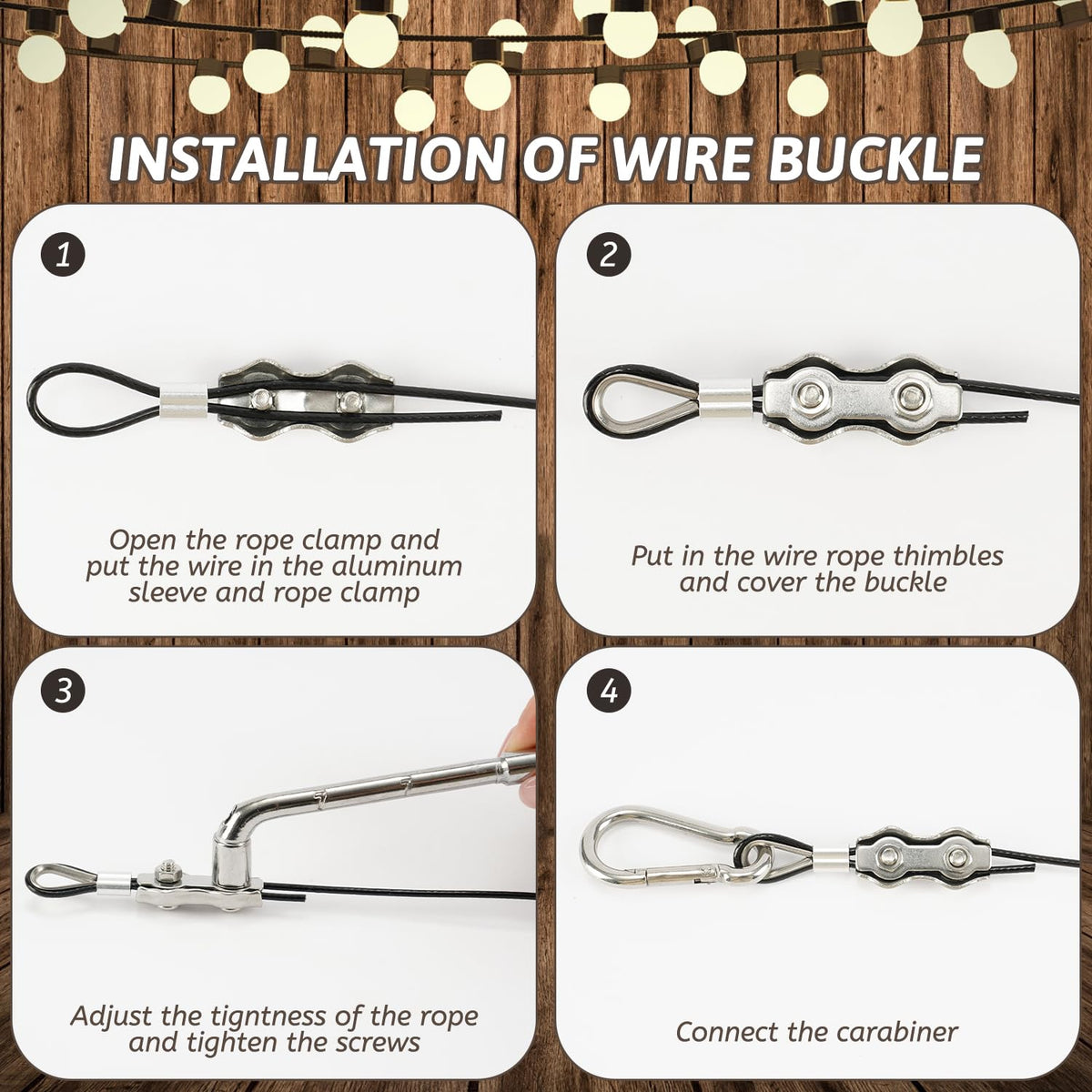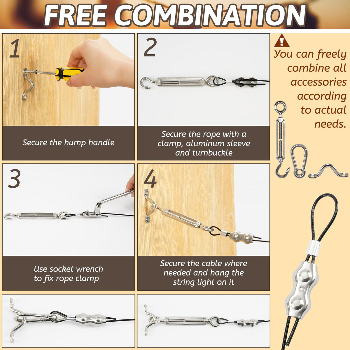 Our string light hanging kit: 1. 480lbs breaking strength. 2. This black coated stainless steel cable is easy to hide at night, so it won’t affect the visual of lights. 3. Socket wrench, more convenient and faster fixed rope clamp. 4. Double rope clamp, More secure fixed wire rope than single clip. 5.It can be used for hanging string lights ,Globe Lights,clothesline,picture display and so on.