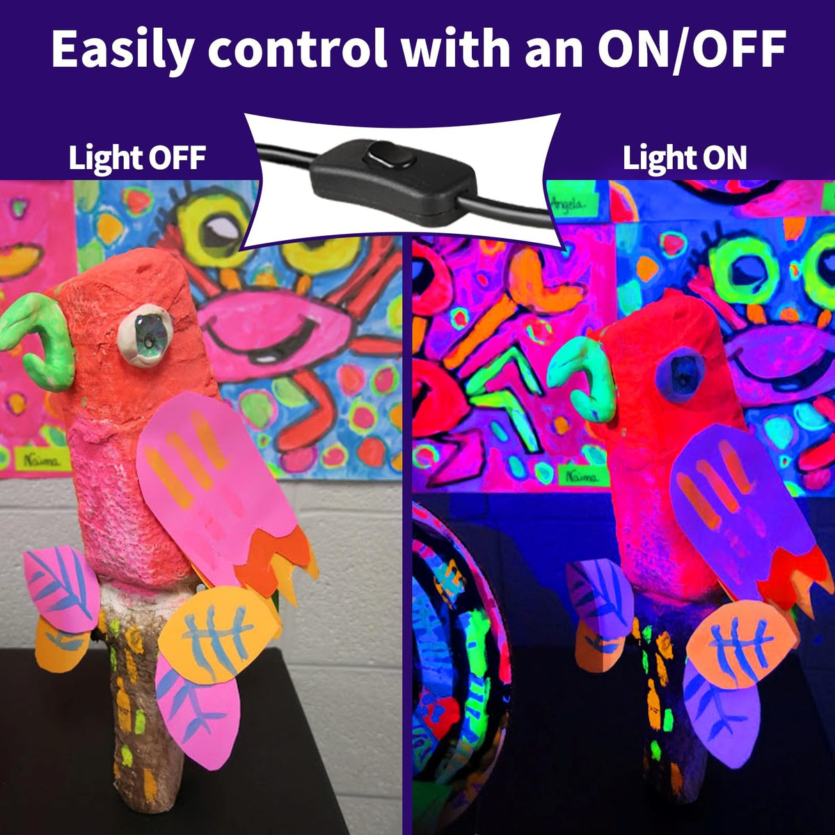 The LED black light bar is excellent. You can angle the bracket on the back to position the light in many directions. It has a cool, subtle, blacklight effect on anything white and covers a large area.The blacklights work perfectly even after numerous rains. It will definitely make for a great glow day! Specifications: