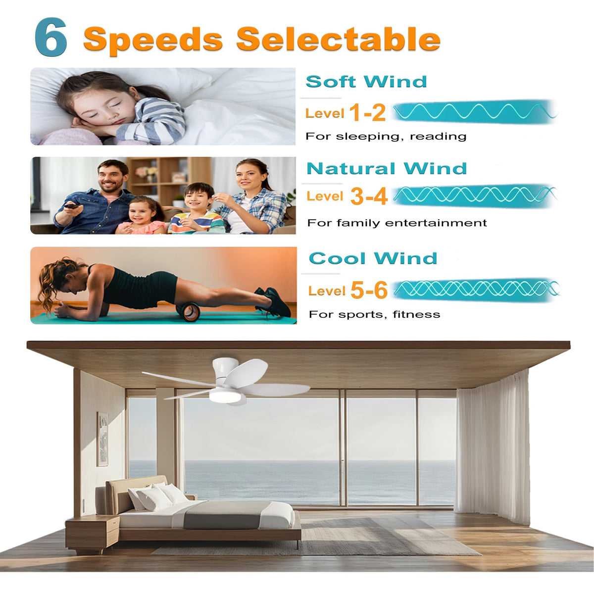 42 Low Profile Flush Mount Ceiling Fan with Lights & Remote, Dimmable 3-Color LED, 6 speed wind, Reversible DC Motor,Timer, Memo
