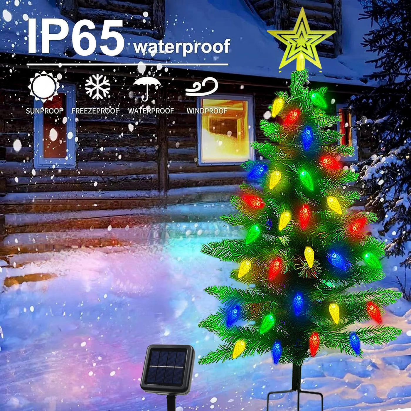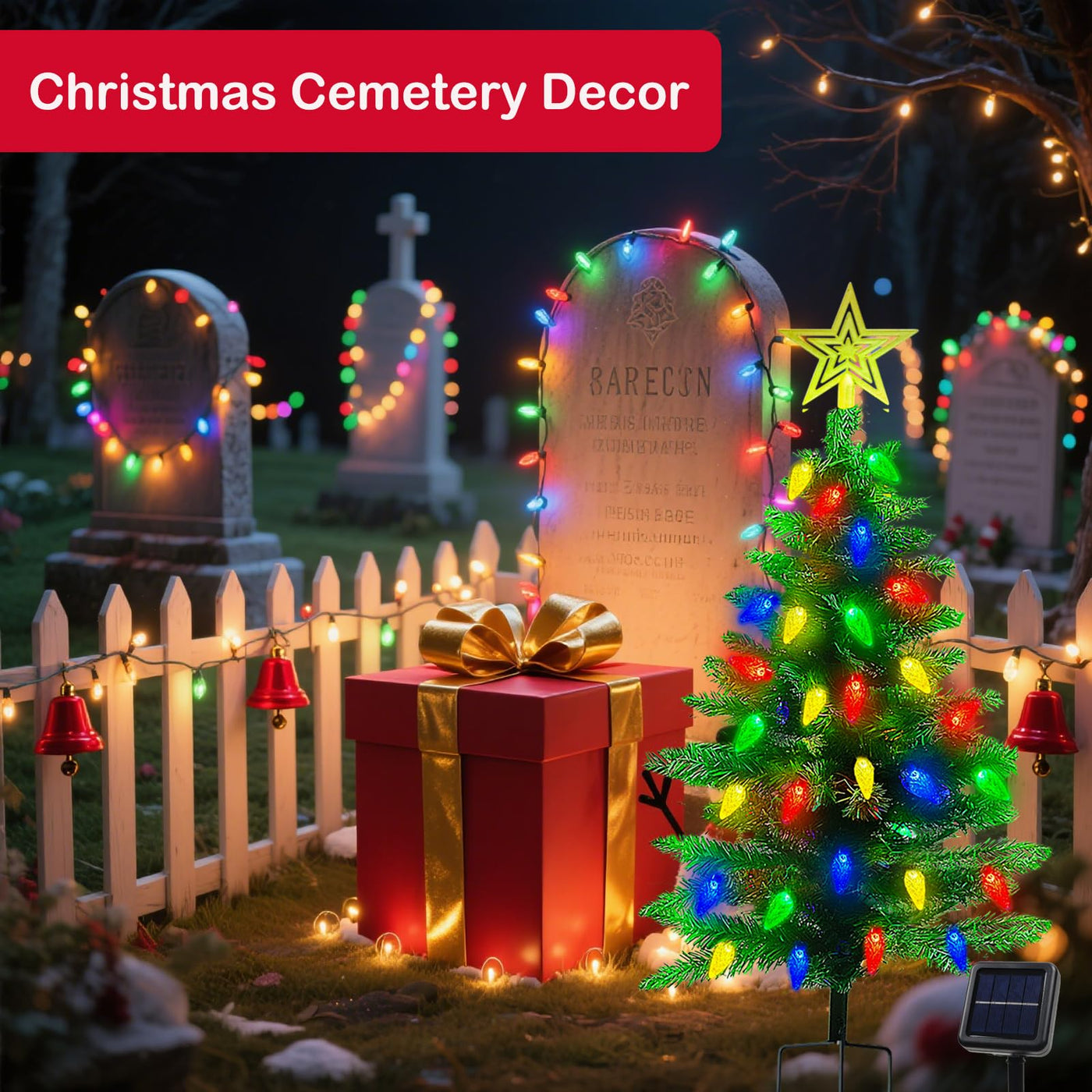 Upgraded 4Ft Solar Christmas Tree With 80 Led C6 Bulb Lights 250 Branch Prelit Xmas Tree With Metal Stand Waterproof Solar Powered Christmas Yard Lights For Porch Pathway Yard Cemetery 1 Pack
