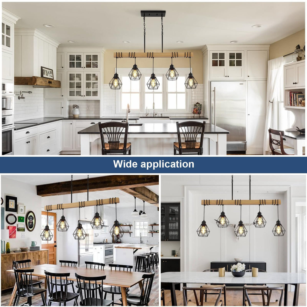 Q: What is the style of this dining room chandelier?A: This chandelier features a modern farmhouse style with a unique diamond-shaped design and a combination of quality logs and handcrafted metal. It adds an elegant touch to your kitchen island or dining room decor, making it both a practical lighting solution and a decorative piece.