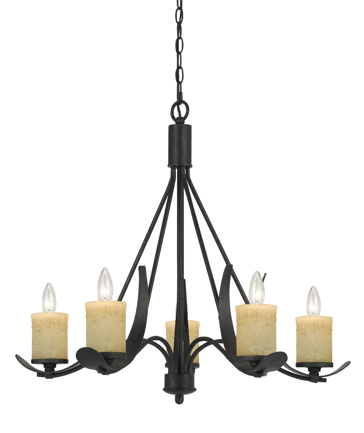 Q: What type of material is the 5 Light Morelis Chandelier made from?A: The 5 Light Morelis Chandelier is constructed from durable metal, ensuring a long-lasting and sturdy design.