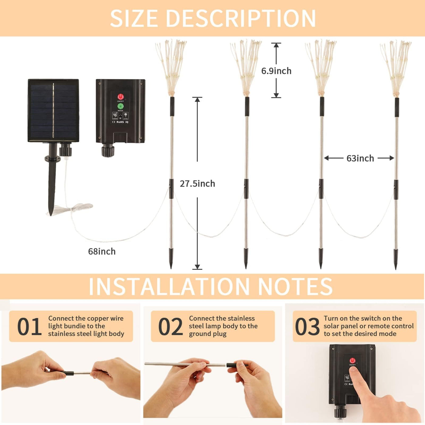 Q: What creative designs can I make with these solar garden lights?A: The AcaJoe solar lights are designed with flexible copper wires that can be bent into various shapes, including fireworks, hearts, lanterns, and flowers. This allows you to unleash your creativity and create stunning displays in your outdoor spaces.