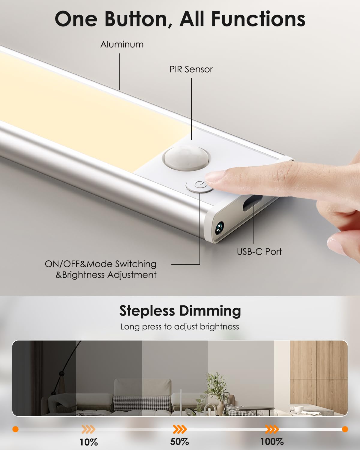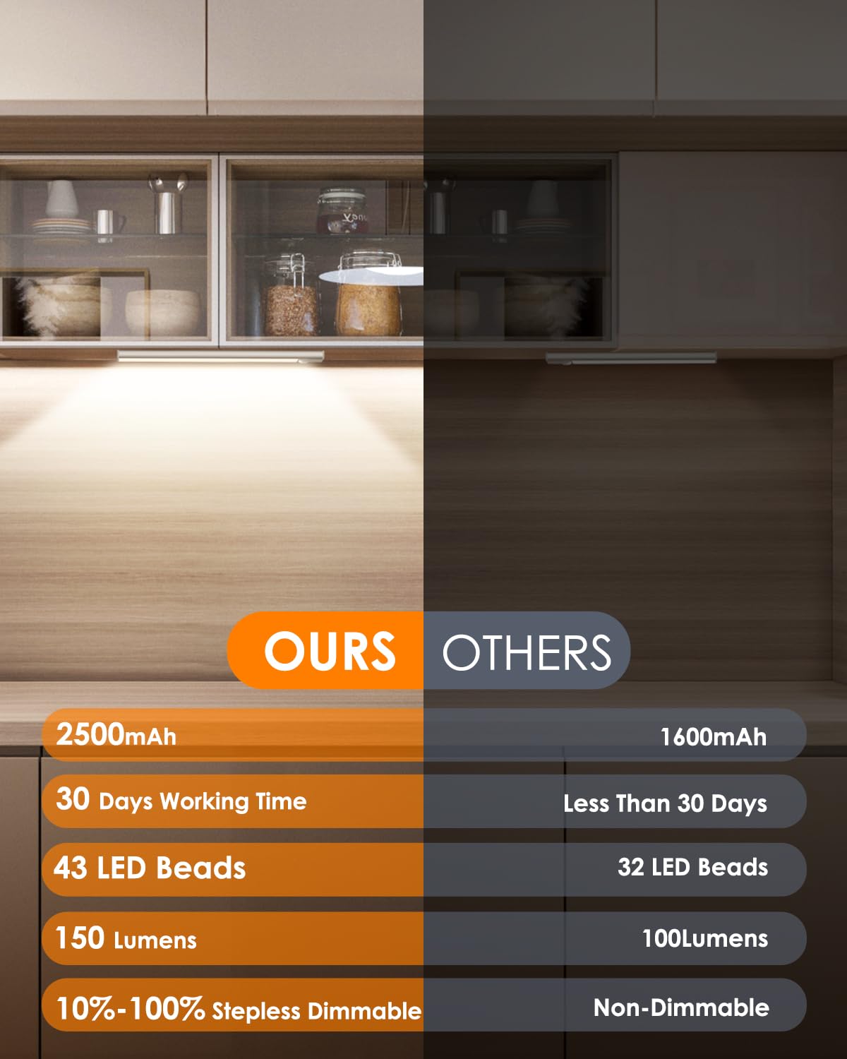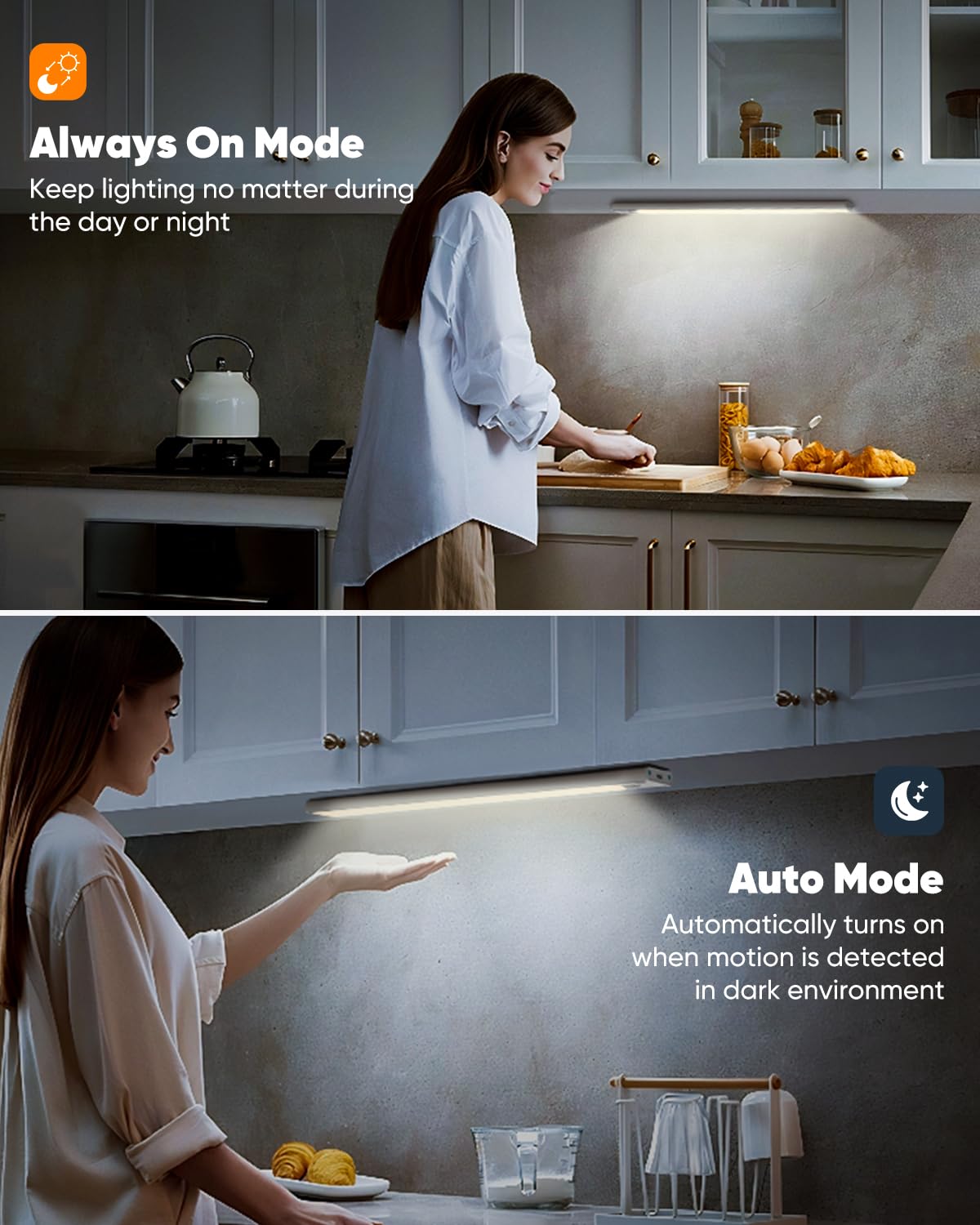 NOTE: Please use the charging cable we provided. Other cables might not be compatible and could cause charging to fail. Do not place the sensors of the two lights too close, as this may cause malfunction or other issues. | ENHANCED 2500 mAh BATTERY: The upgraded VerRon under cabinet light is equipped with a powerful 2500mAh rechargeable battery, designed for long-lasting performance. With USB-C fast charging, a full charge takes just 3 hours. Enjoy worry-free, reliable lighting and say goodbye to frequent recharging and short battery life | SIMPLE STEPLESS DIMMING: Our wireless battery operated lights can suit your brightness needs, they can be easily adjusted from 10% to 100%. This adaptability ensures perfect lighting for any scenario, whether it's a cozy ambiance or task lighting | SUPER BRIGHT & ULTRA THIN: With newly upgraded energy-saving LED beads, the VerRon rechargeable motion sensor light produces up to 200 lumens, making it brighter than your average cabinet light. The newly upgraded light fixture is not only brighter but also has a slimmer 0.35inch thickness, which makes it easy to match any home style, whether farmhouse, modern, or otherwise | TWO LIGHTING MODES: VerRon LED under-cabinet lighting offers two modes: Auto Mode and Always-On Mode. In Auto Mode, the advanced motion sensor detects movement and activates the light in dark environments, ideal for safe, hands-free illumination. Always-On Mode provides continuous light, perfect for cooking, reading, or other tasks | WIRELESS INSTALLATION: These kitchen lights come with a strong magnet and adhesive iron sheet for quick, tool-free installation. Sensor lights are easily removable, offering flexible lighting for kitchens, closets, cabinets, pantries, basements, stairs, hallways, bookshelves, and more. Perfect for temporary illumination, recharging, or repositioning