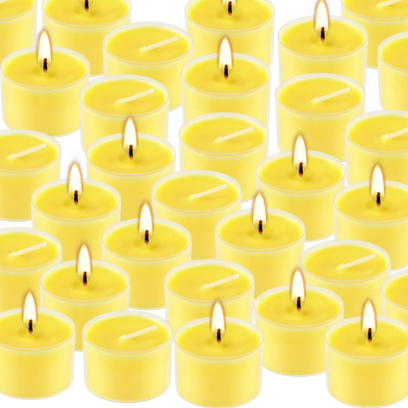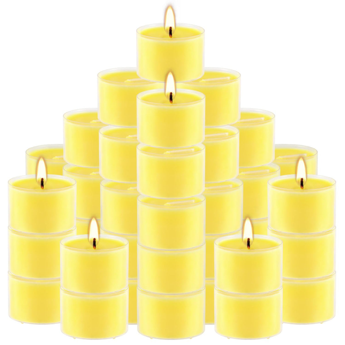 50-pack small yellow tea candles in clear plastic cups offer a convenient and clean burning experience, providing up to 8 hours small yellow tea candles of long-lasting illumination infused with natural citronella essential oil for a cozy and refreshing ambiance.