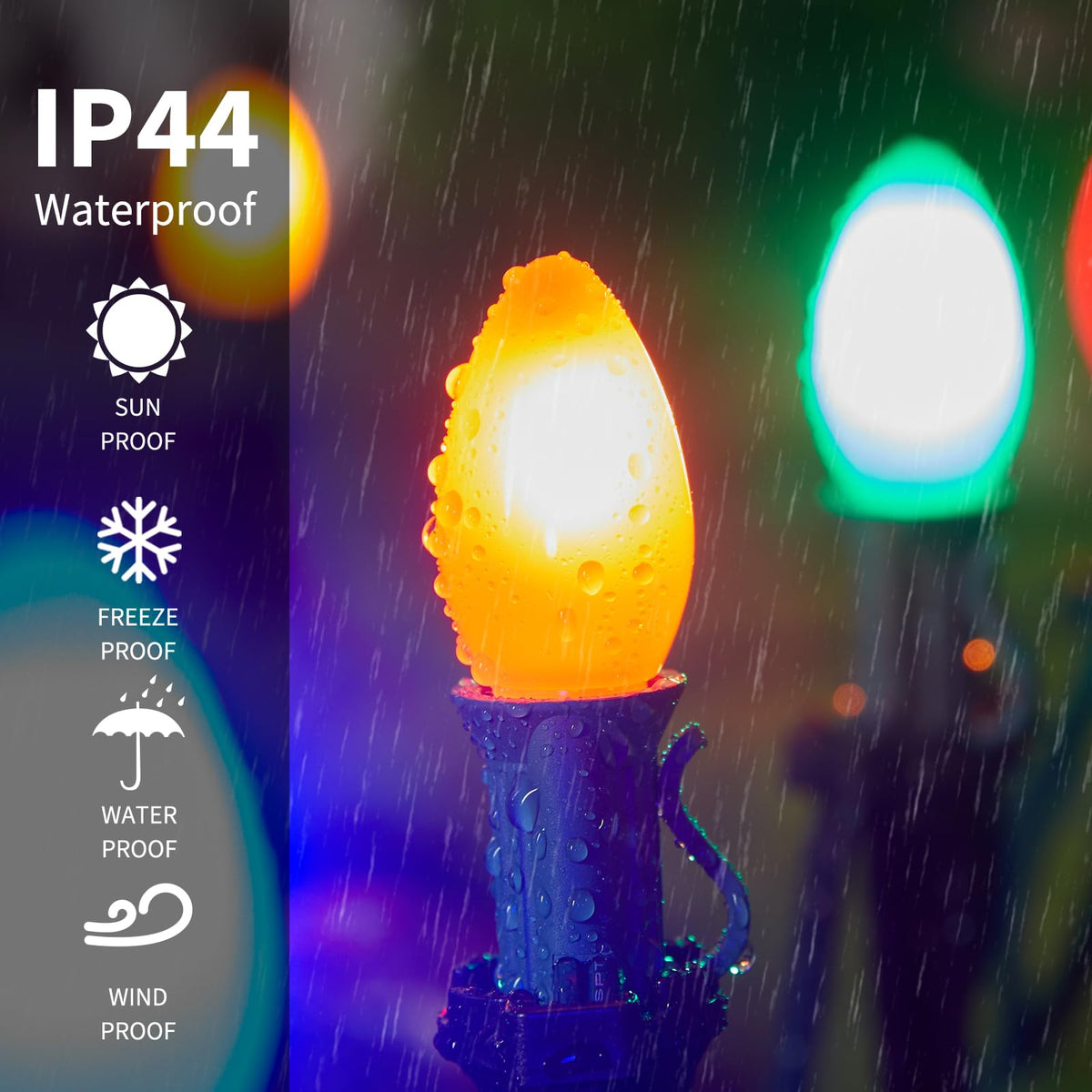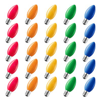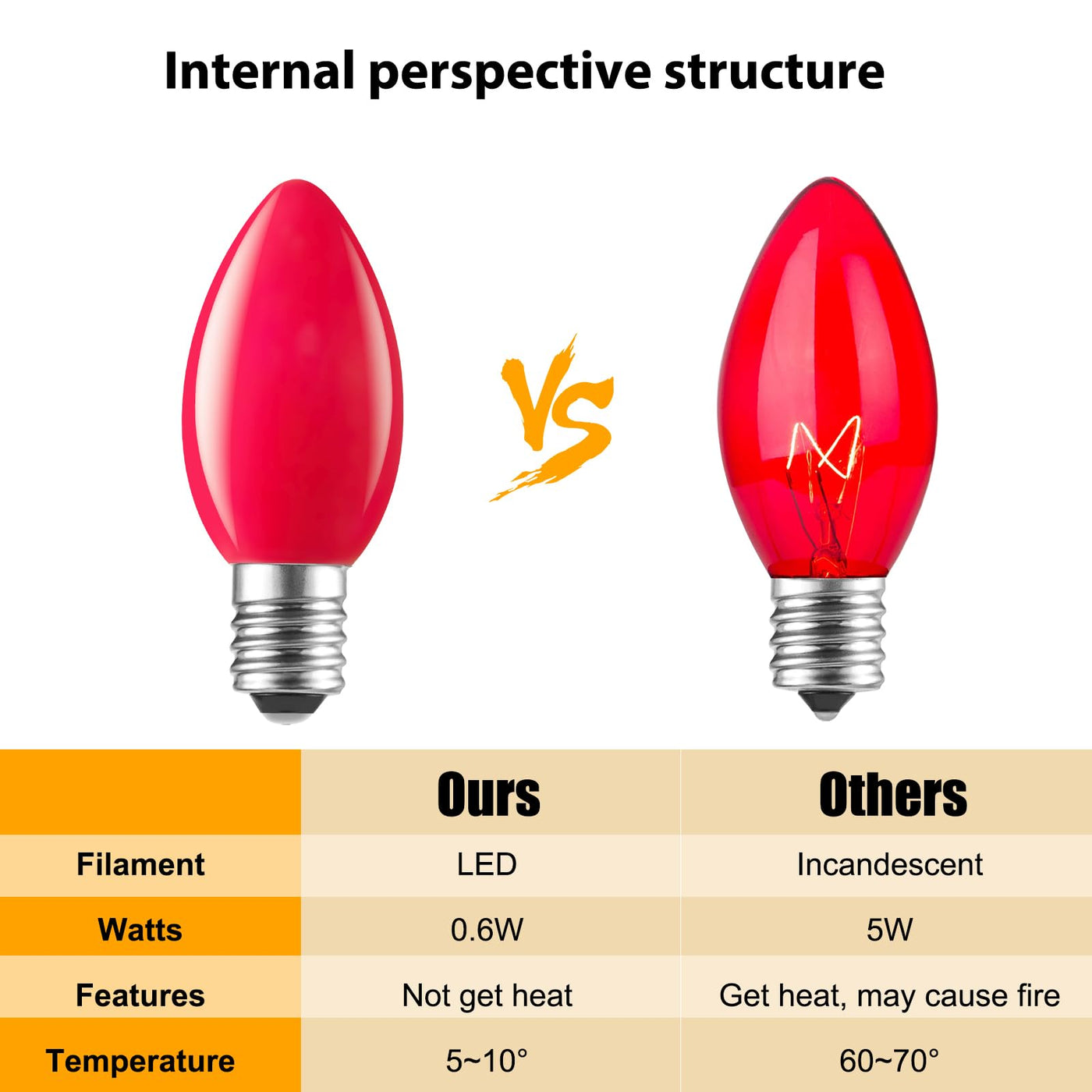 ENERGY SAVING AND MONEY SAVING: Save more than 90% compared to traditional incandescent bulbs. Each clear bulb 1W is equivalent to a 7W C7 incandescent bulb, LED bulbs create enough brightness to add a vintage holiday atmosphere to your house, Christmas tree, yard, party decorations. | HIGH QUALITY: Commercial grade C7 LED replacement bulbs with an average lifespan of 10,000 hours. Good choice for Christmas tree string lights, salt lamps, LED chandelier bulbs, night lights, plug-in night lights, decorative lighting, salt baskets, outdoor patio lights. UL listed, safe for indoor and outdoor use. | EXQUISITE DESIGN: Retro shape and smooth surface create colored glow. String lights suitable for E12 socket, perfect combination of classic style appearance and energy saving efficiency of LED, your house add traditional vintage style atmosphere. | INDOOR AND OUTDOOR DECORATIVE LIGHTING: Plastic bulb housing, shatterproof and waterproof for more durability, no more need to remove glass from broken bulbs, bright LED C7 replacement night light bulbs create a cheerful festive atmosphere during the holidays, Christmas, or all year round. | Bring the magic of Christmas back to your outdoor lighting projects when you hang C7 bulbs along your roof and wrap them around columns and trees!