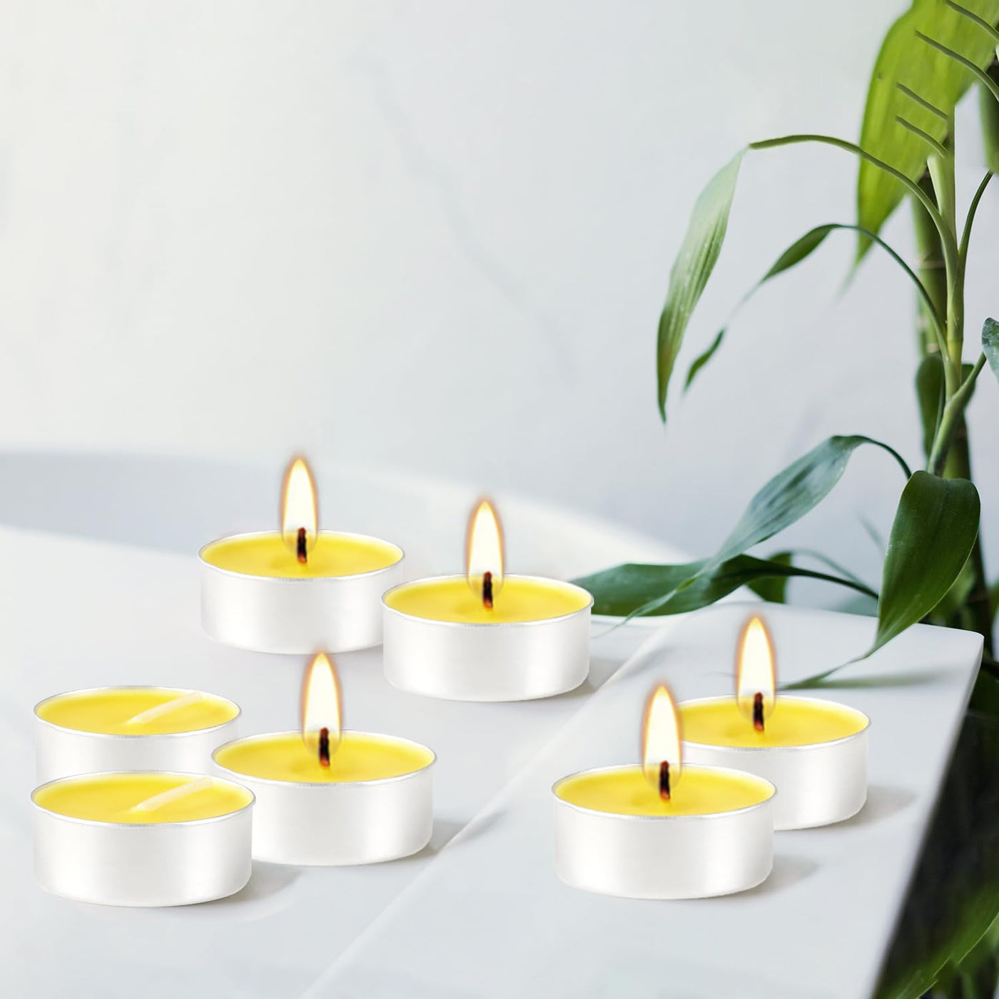 Q: How long do the 50 Pcs Citronella Tealight Candles burn?A: Each citronella tealight candle burns for up to 4 hours, providing a long-lasting and enjoyable experience for your gatherings or personal use.