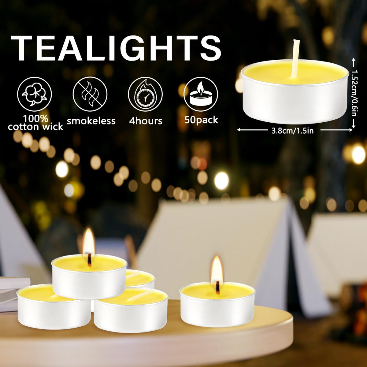 50 Pcs Citronella Tealight Candles, Smokeless And Dripless Candles In Bulk,For Home Patio Balcony Backyard,4 Hour Burn,Yellow