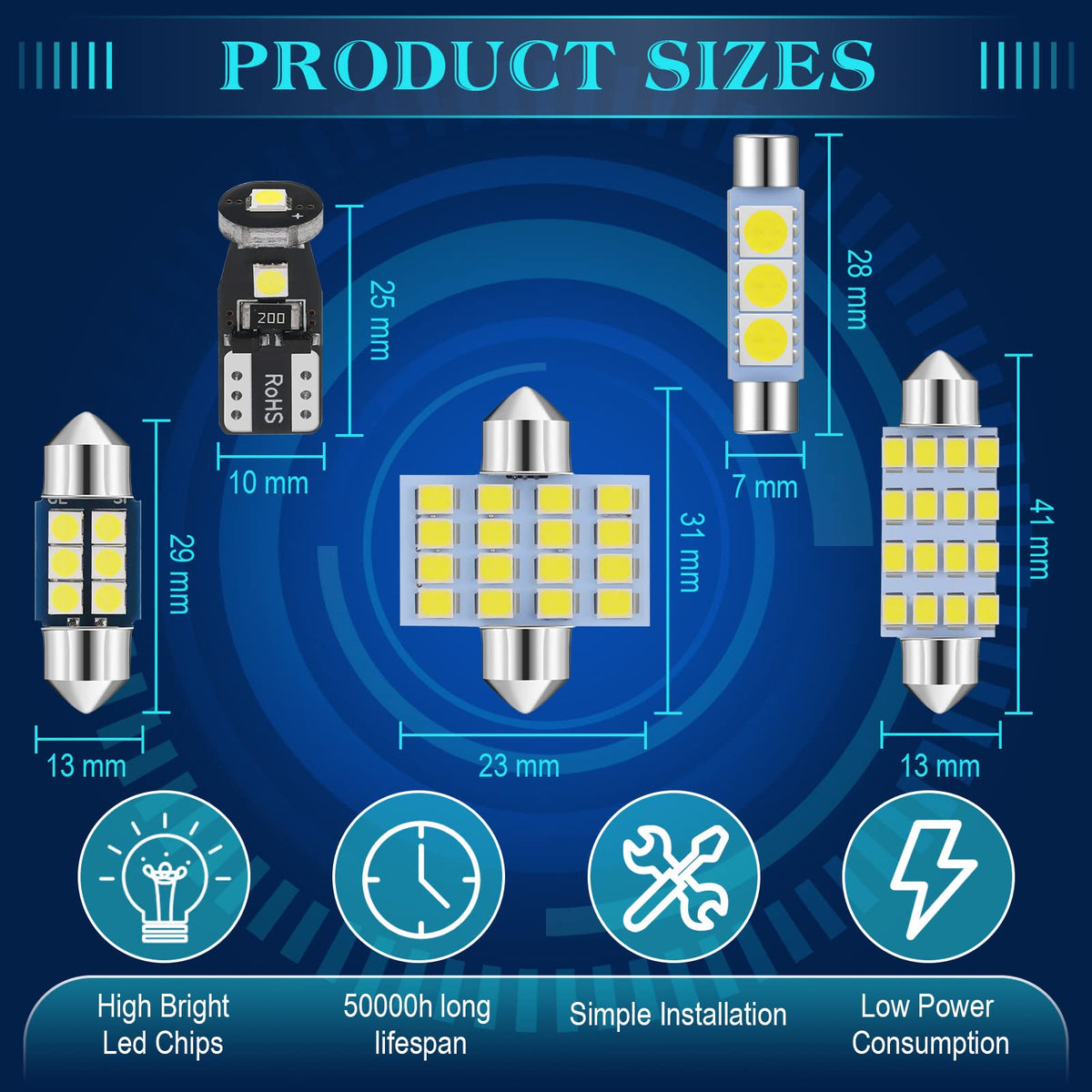 Q: What types of vehicles are compatible with the LED car bulb kit?A: The 50 Pieces LED Car Bulb Kit is designed to be compatible with most car and truck interior lights. They can be used for various applications including dome lights, map lights, license plate lights, and more. It’s recommended to check the socket size of your original bulbs before purchasing to ensure proper fit.
