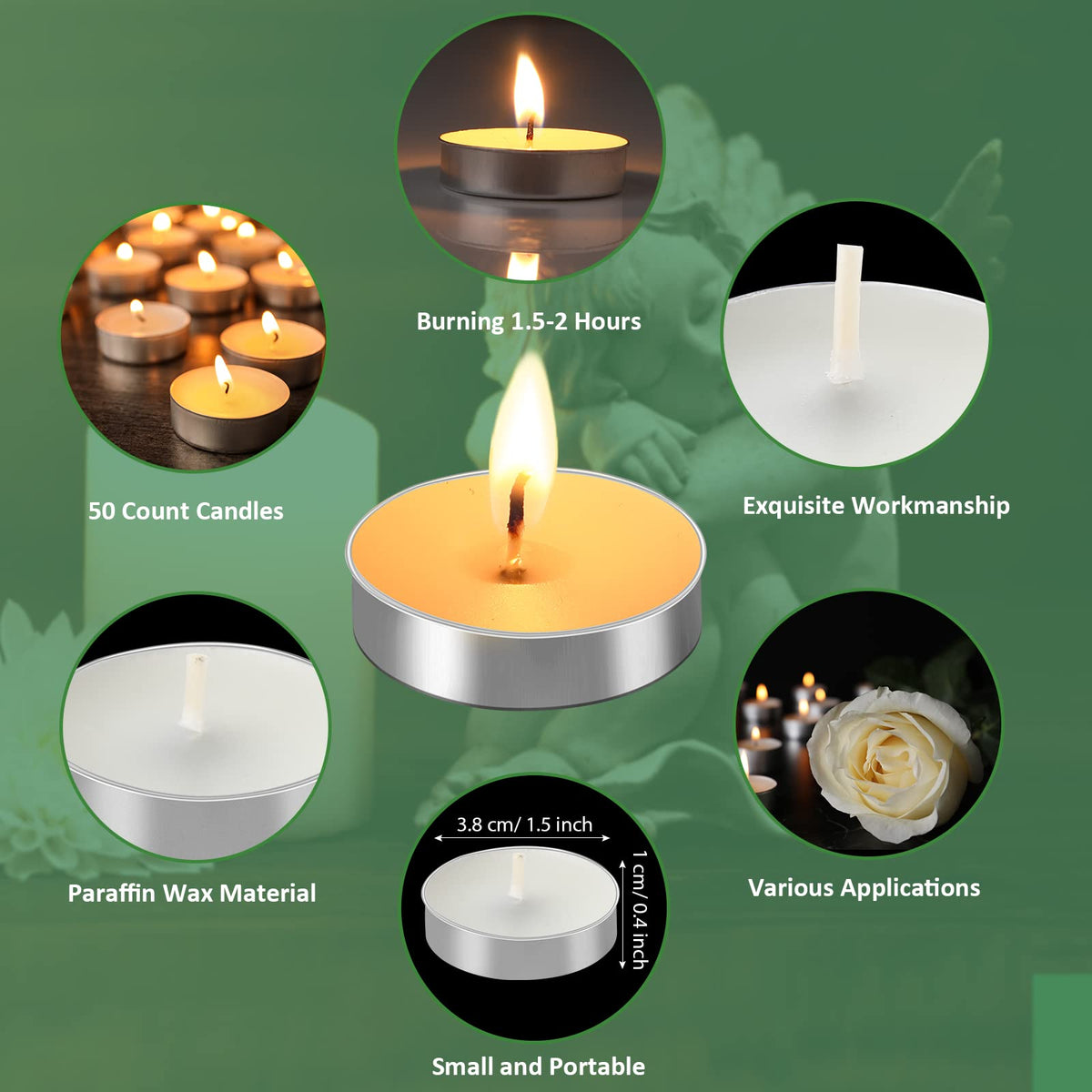 Q: What are the dimensions of the candles and cards included in the set?A: The unscented candles measure approximately 3.8 x 1 cm (1.5 x 0.39 inches), while the condolence cards are about 6 x 4.8 cm (2.36 x 1.89 inches). This size is designed to be easily handled and displayed during memorial services.