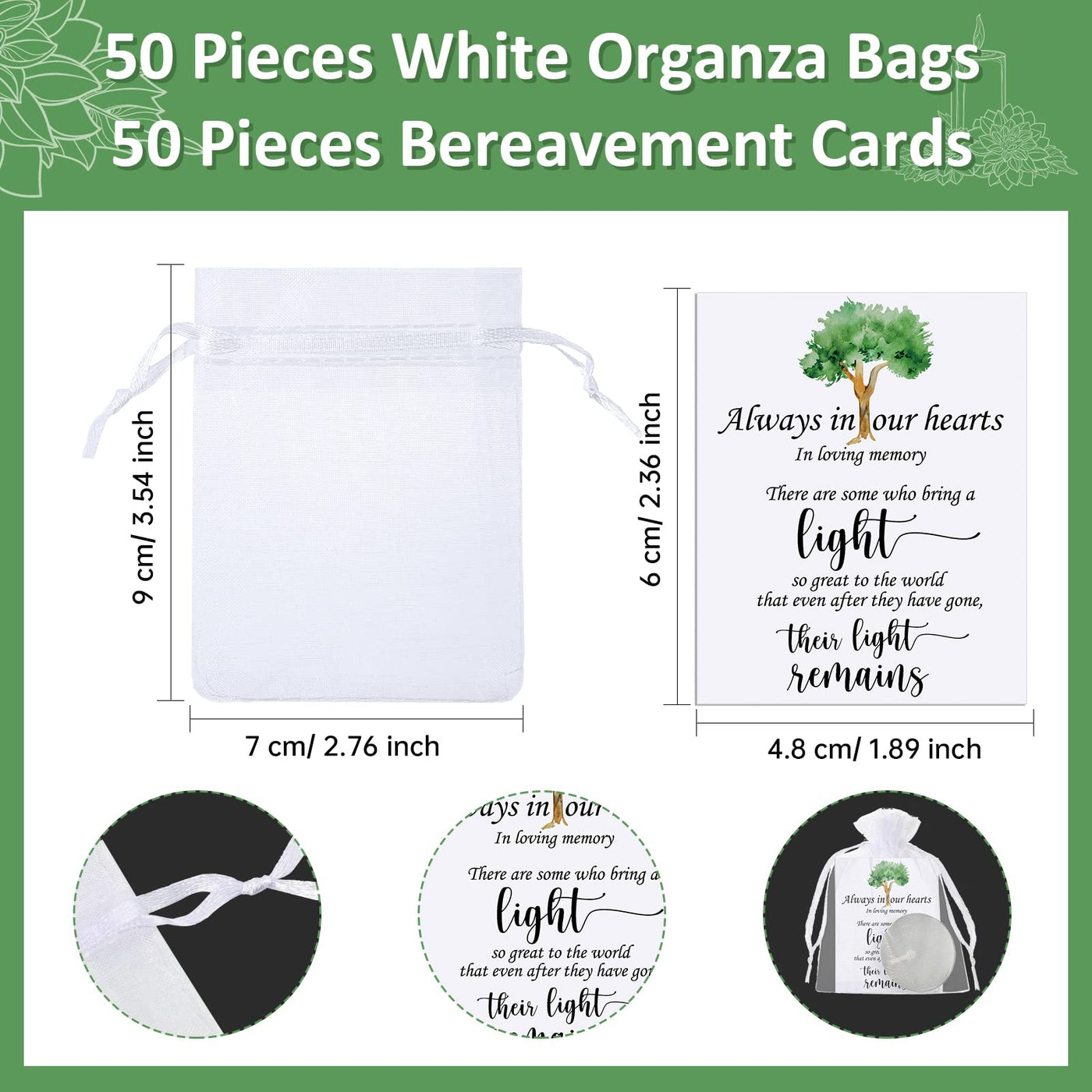 Features: Condolence gifts: The sympathy candle can be applied as a sympathy gift for those who have lost a father, mother, grandfather, grandmother, son, daughter, brother, sister, uncle, aunt, etc. They will feel your concern and love. Practical organza bag: Our memorial gift comes with a gauze bag, which can not only be applied to hold cards and candles, but also help you to collect other small items and provide more convenience for your life. Specifications: Material: wax, paper, organzaColor: as shown in the picturesSize: Candle: about 3.8 x 1 cm/ 1.5 x 0.39 inchesCard: about 6 x 4.8 cm/ 2.36 x 1.89 inchesOrganza bag: about 7 x 9 cm/ 2.76 x 3.54 inchesPackage includes: 50 x Unscented candles50 x Condolence card50 x Organza bagNotes: Manual measurement, please allow slight errors on size. The color may exist a slight difference due to different screen displays. Small parts included, please keep away from children in case of choking risk.