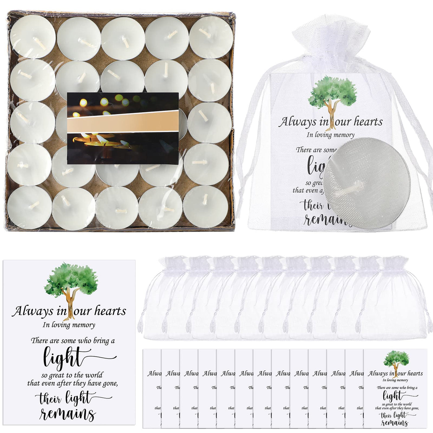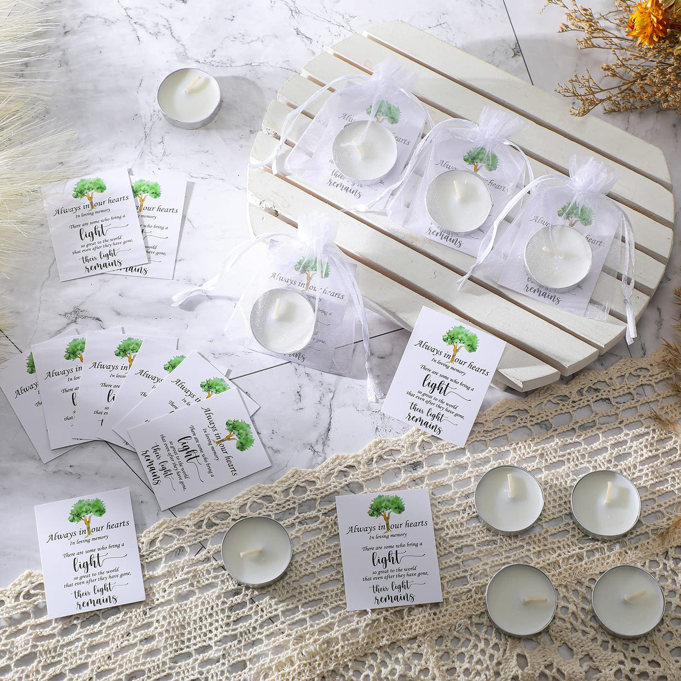 Q: Are the candles and materials safe for use?A: The candles are made from quality wax, ensuring a safe burning experience. The condolence cards are crafted from thick coated paper, and the organza bags are made of soft, durable organza. However, please keep small parts away from children to avoid choking hazards.