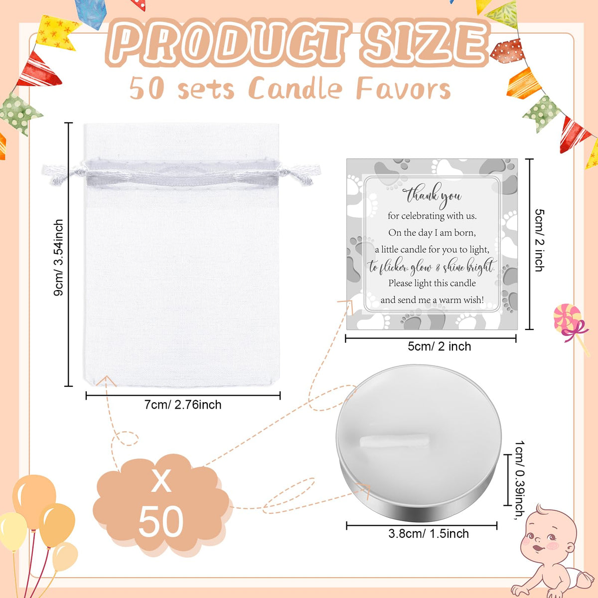 Q: What are the dimensions of the tealight candles included in this baby shower favor set?A: The tealight candles included in the set have a diameter of approximately 1.5 inches (3.8 cm).