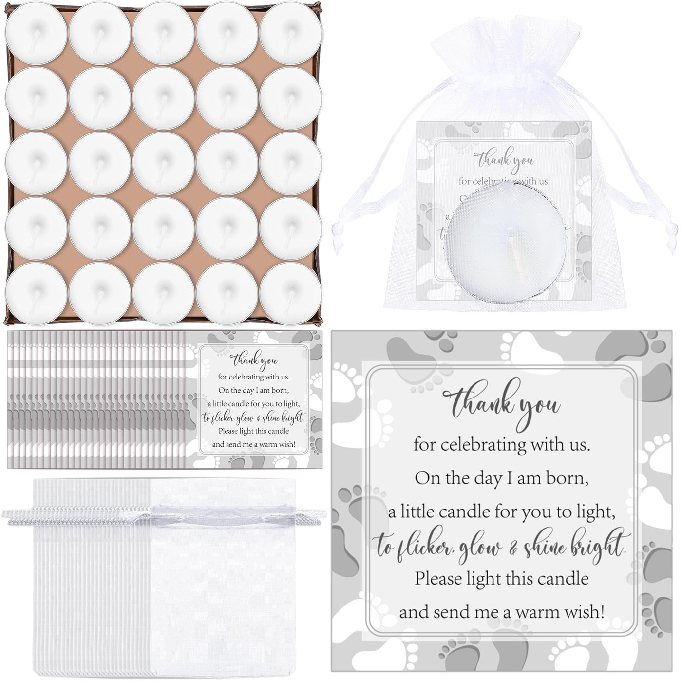 50 Sets Baby Shower Party Favors Including 50 Pcs Unscented Tealight Baby Shower Candles 50 Pcs Gift Bags 50 Pcs Baby Shower Cards For Baby Shower Gender Reveal Party Supplies (White Silver)