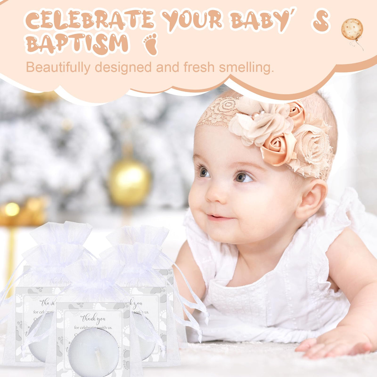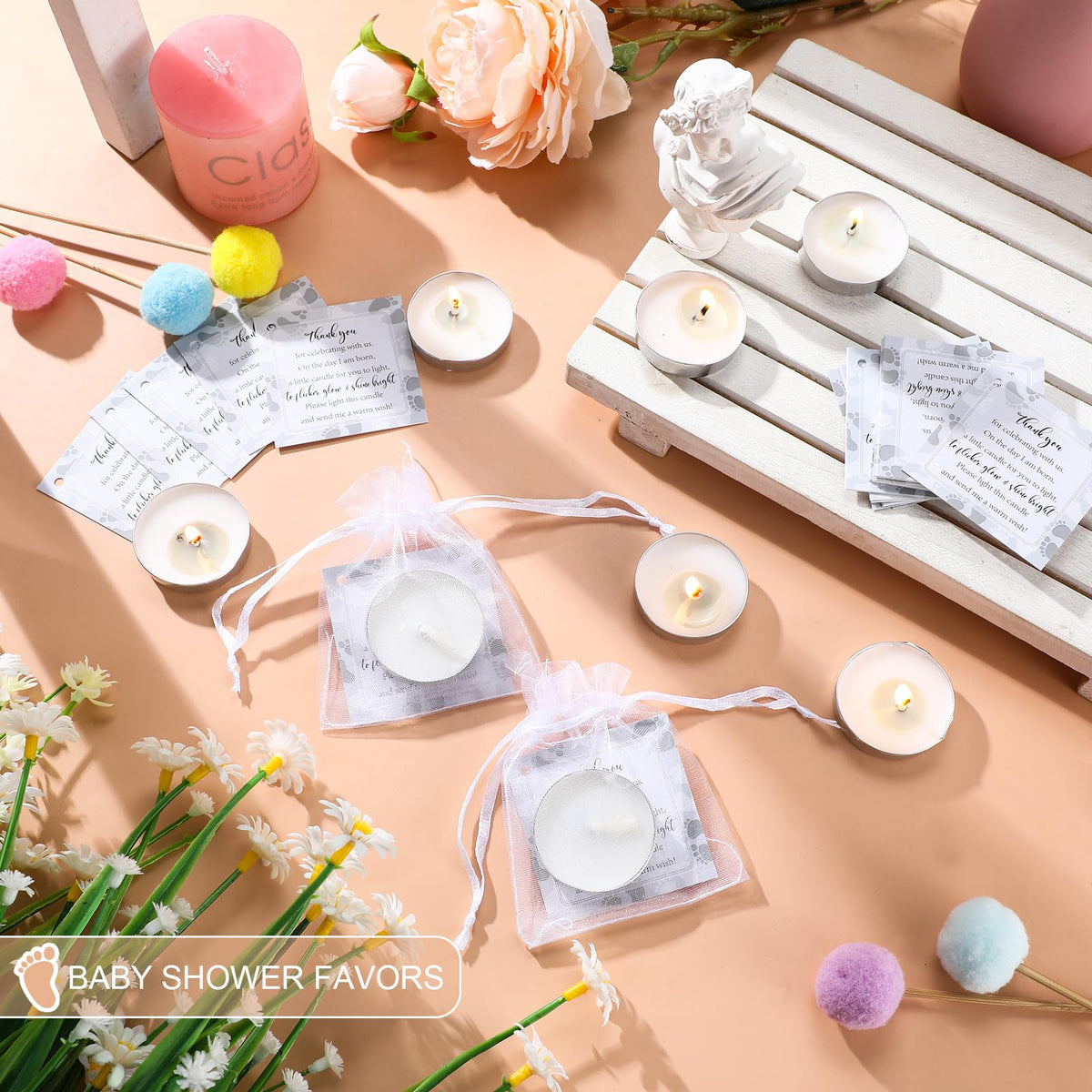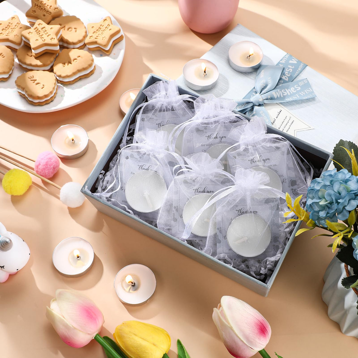 Q: Are the candles scented or unscented?A: The tealight candles in this baby shower favor set are unscented, making them ideal for creating a warm atmosphere without overpowering scents.