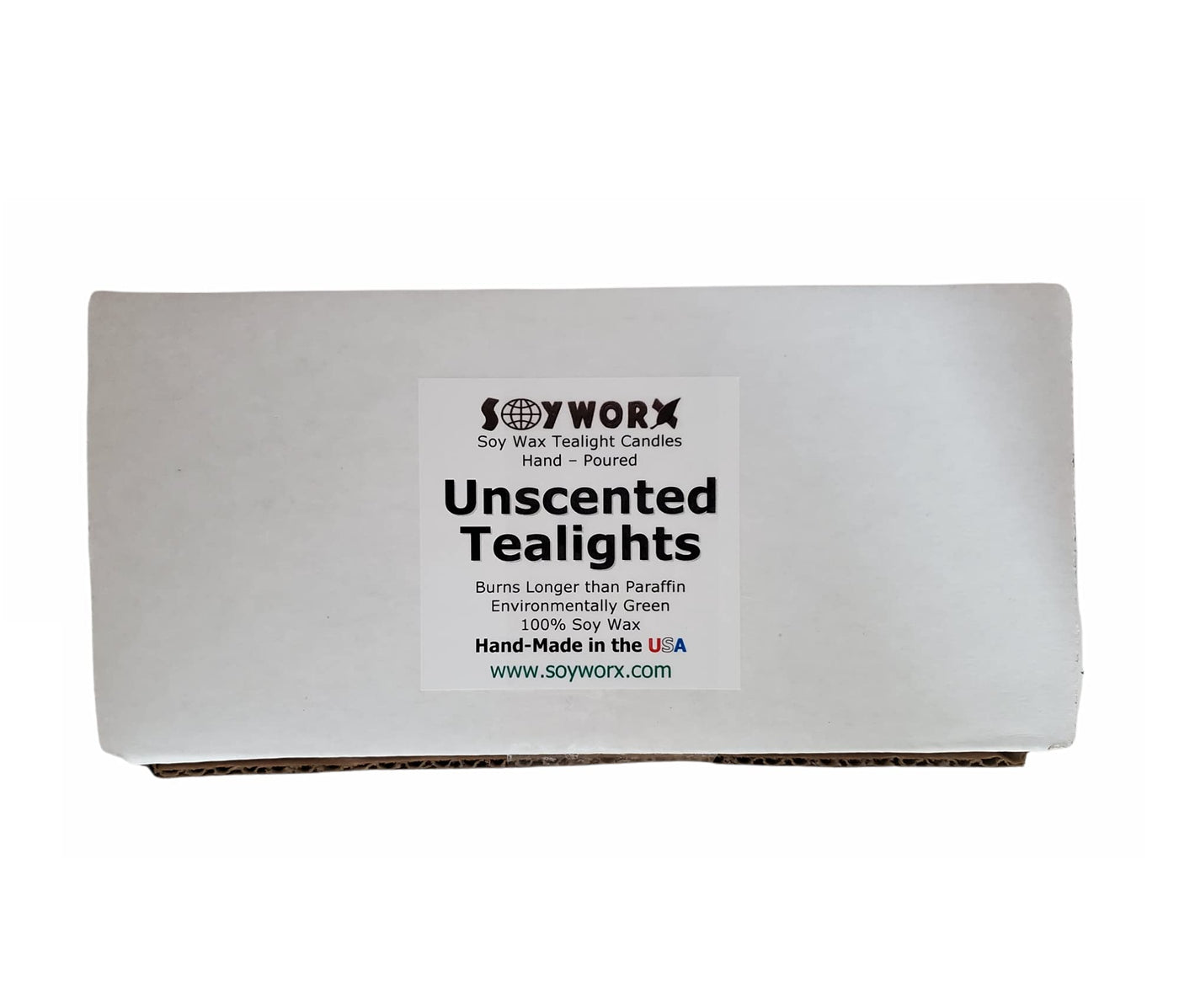 A pack of 50 clear cup unscented Soy wax tealight candles - white - no color added. Soy wax burns longer & cleaner than traditional parrafin candles. It's easily cleaned up with warm soap & water if spilled. Soy wax is also non-toxic, kosher & vegan! Soyworx proudly presents these candles that are hand poured in small batches right here in America! Plus every order comes with a Free Sample of a Scented Tealight & Ink Pen. Soyworx - "There's Something Green In There!"