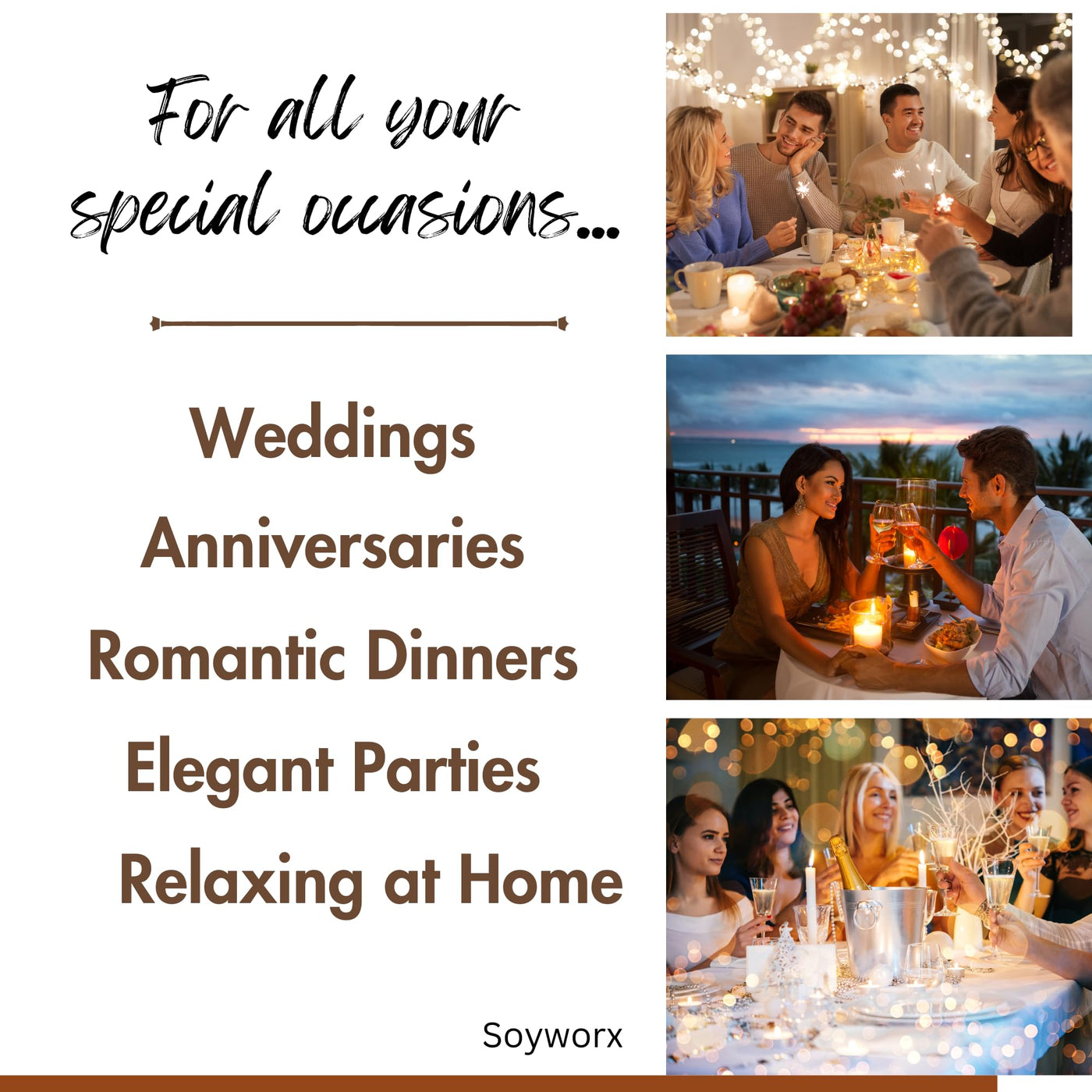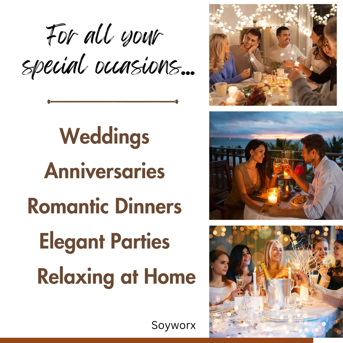 Q: What are the benefits of using soy wax tealight candles?A: Soy wax tealight candles burn longer and cleaner than traditional paraffin candles. They are made from 100% natural soy wax, which is non-toxic, kosher, and vegan, making them a healthier choice for your home.