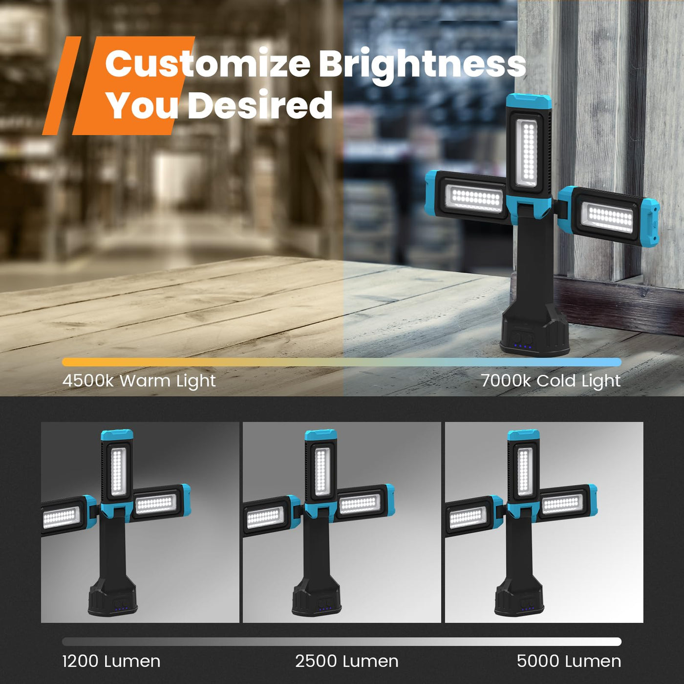 Q: Can the LED panels be adjusted?A: Absolutely! The work light features 3 flexible LED panels that can rotate vertically 180° and horizontally 270°, allowing you to customize the lighting direction to suit your needs.