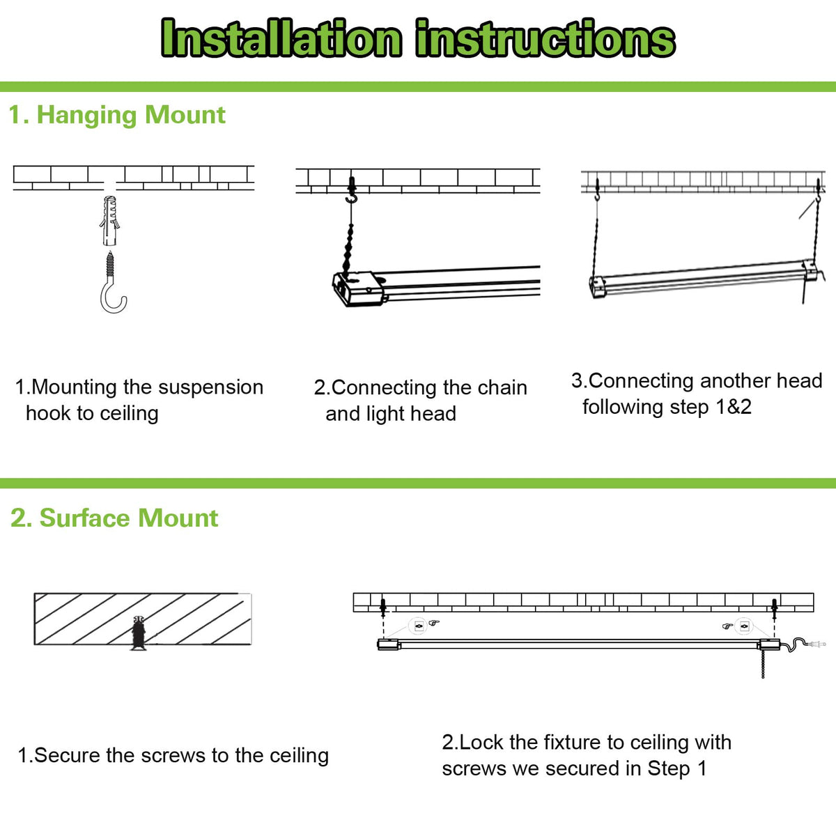 Package Content -4ft 42W LED Shop Light Fixture X 1 -Hanging Chain X 2 -"S" Hook X 2 -Mounting Screw(for flush mount) X 2