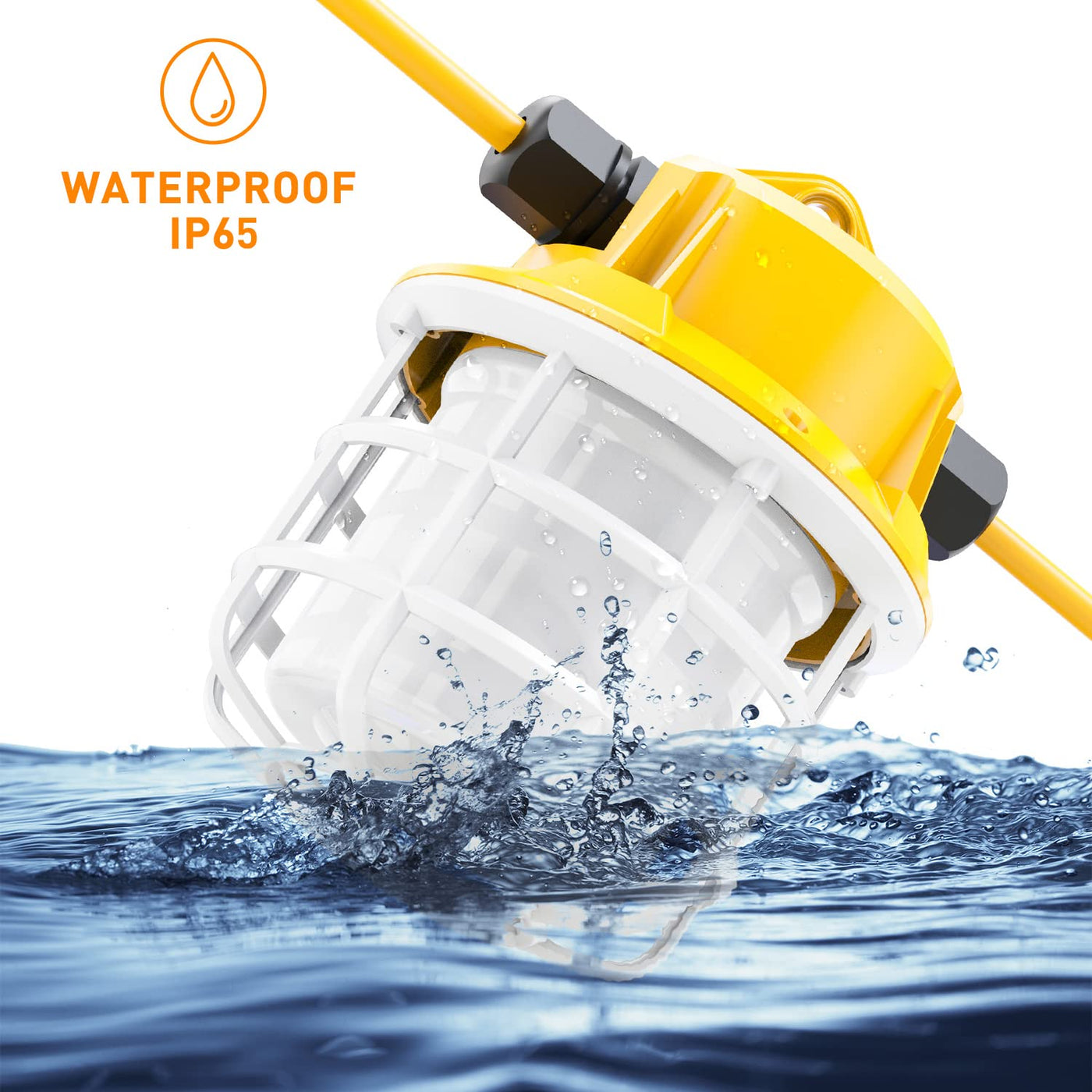 Q: What are the main features of the 50ft LED Construction String Lights?A: The 50ft LED Construction String Lights feature high lumen output of 75W and 7500LM, making them suitable for various commercial and industrial lighting needs. They are IP65 rated for dust and water resistance, have protective covers to prevent damage, and are easy to install with a plug-and-play design. Additionally, they are portable and flexible, allowing for customizable light distribution at job sites.