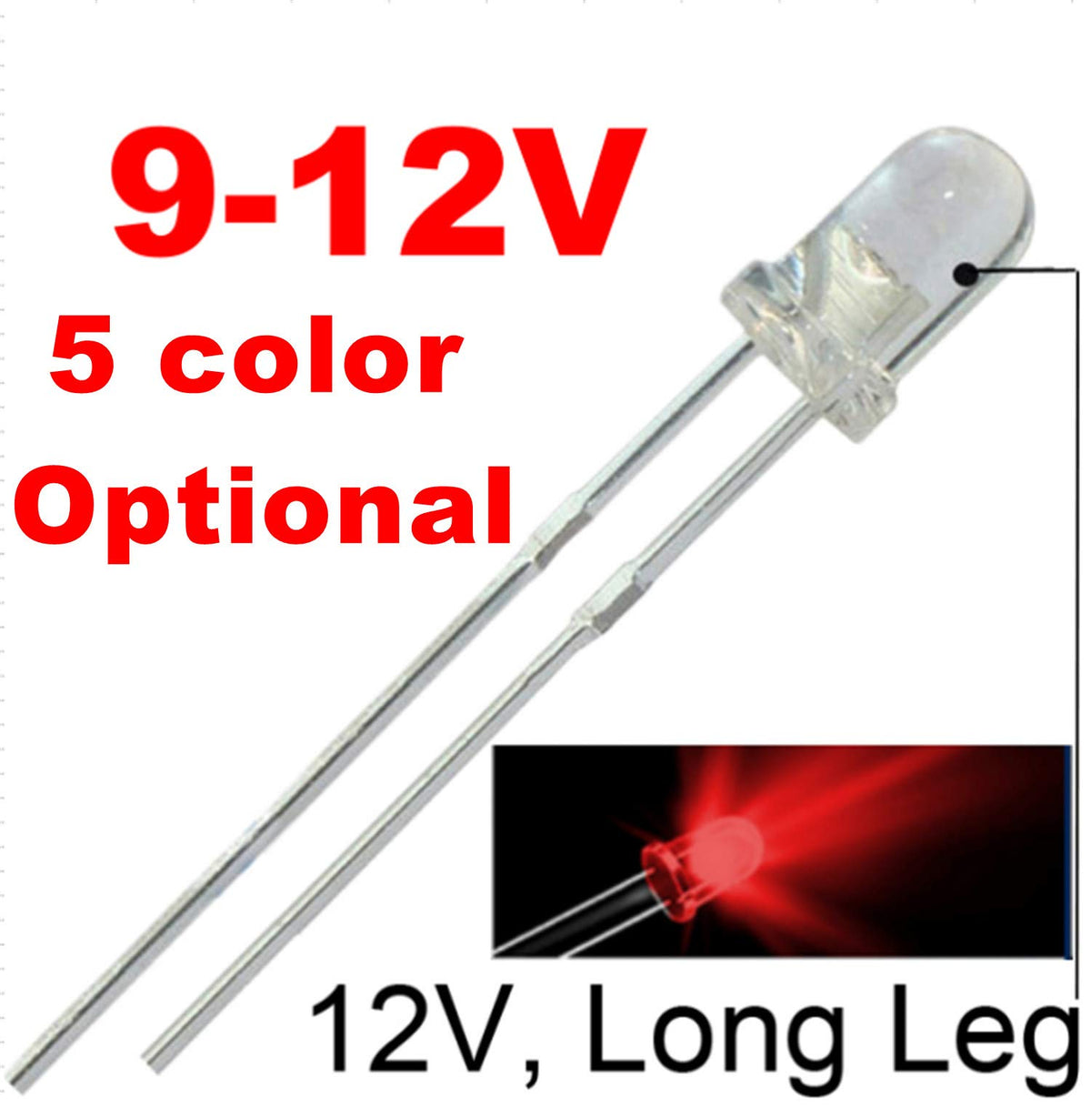 work in 9-12Volts Do not need add any resistor, it can work in 9-12Volts directly Specifications : -Size: T1 Round (waterclear) LED or 3mm Round (waterclear) LED Brightness: 5,000-6,000MCD -Emitting color:Red. -Forward voltage:9V~12VDC Compatible. -Forward current Typical: 15mA or below; Max: 20mA -Viewing angle: 25-35 Degree- Applications & Installations Ideal for 9-12V LED replacement for computers, radio, dashboards, or any battery or power supply that the voltage in 9-12V .etc. Very low power consumption, and high luminous intensity Recommended voltage is 12V Package included : 50pcs T1 Round (waterclear) LED or 3mm Round (waterclear) LED(Red) Search ''bowerful '' for more related leds