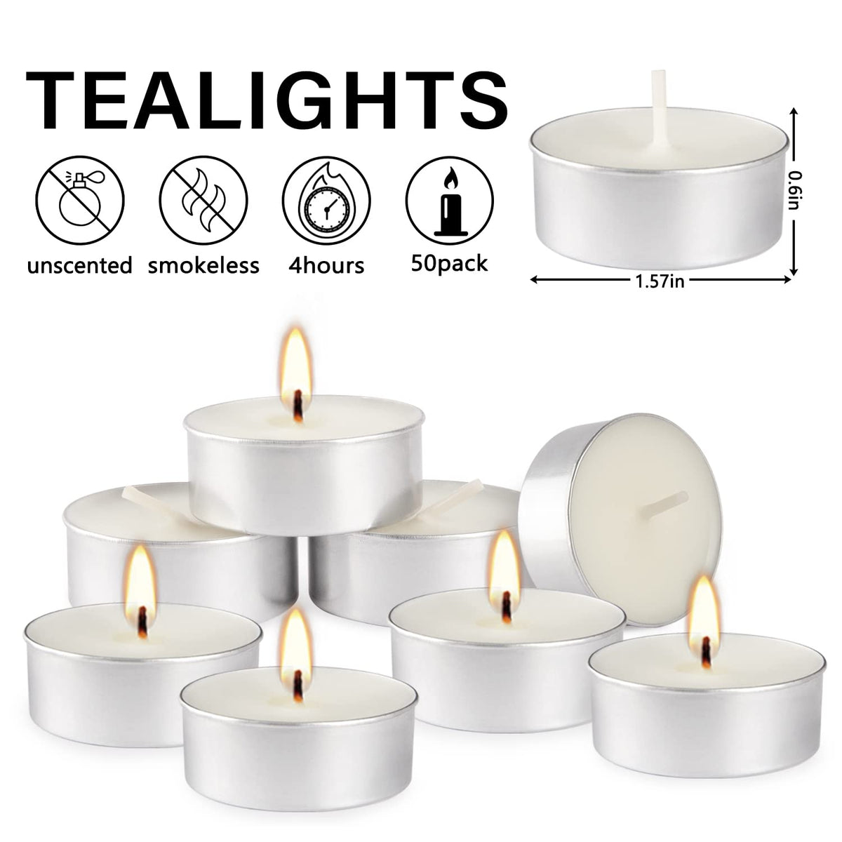Q: What are the dimensions of these tea light candles?A: Each tealight candle measures 1.57 inches in diameter and 0.6 inches in height, designed to fit into most standard tealight holders.