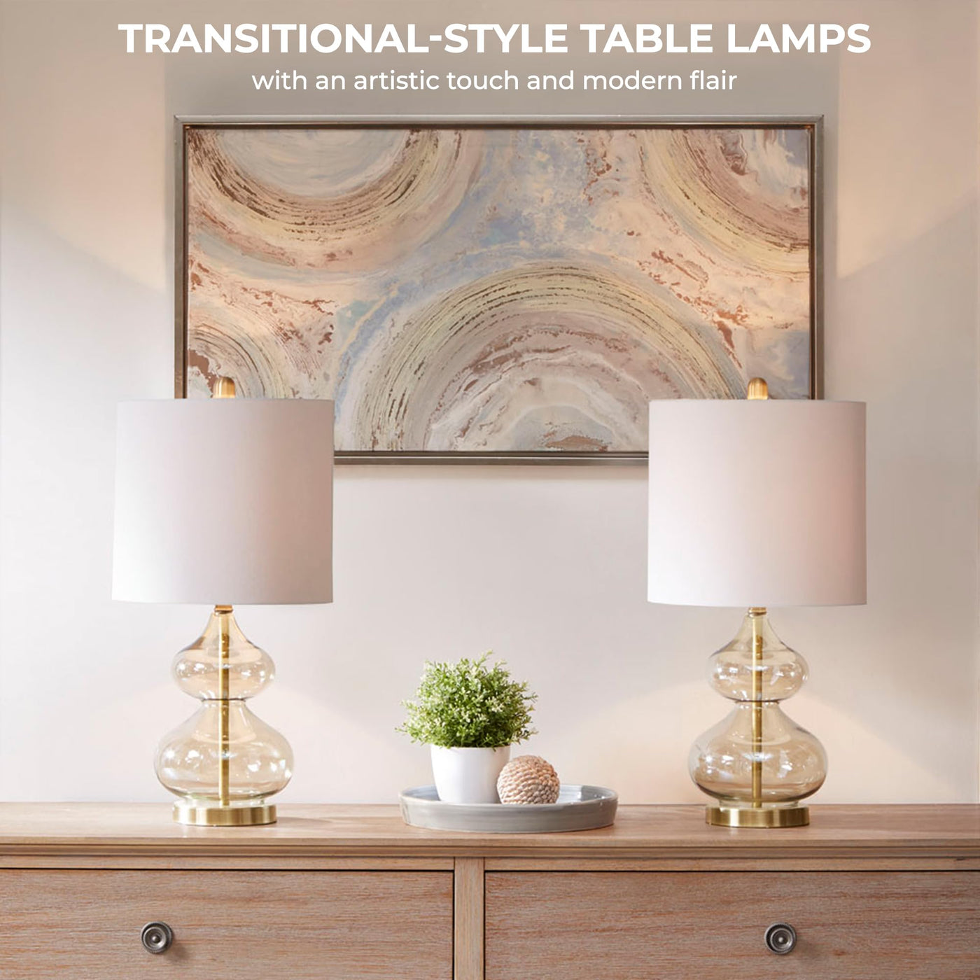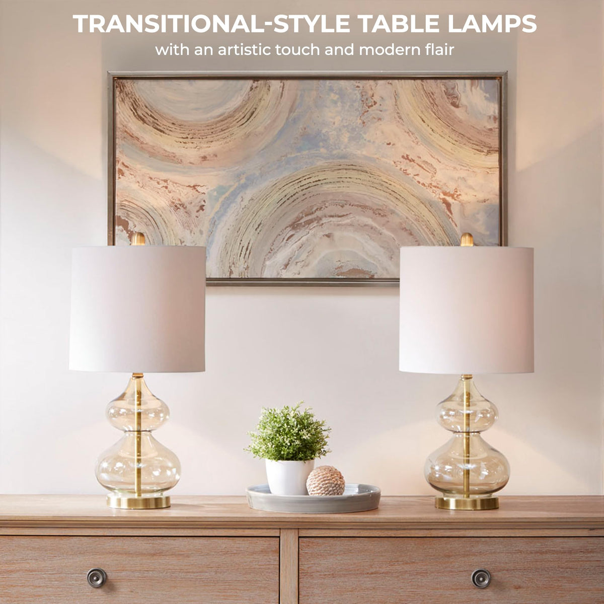 The Ellipse Curved Glass Table Lamp, Set of 2 provides a tasteful and charming touch to any space. The elegant curves of the gold glass base are complemented by a white drum-shaped shade, creating a chic look that enhances any room's decor. Ideal for accenting your living room or adding light to your bedroom, these lamps embody transitional appeal.