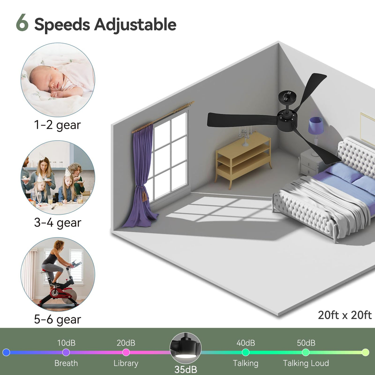 ?52-Inch Modern Ceiling Fan?This outdoor ceiling fan is perfect for both indoor and outdoor spaces. Its 52-inch propeller design ensure wide coverage and quiet operation, ideal for your living room, bedroom, patio, garage, or open spaces. With a dimmable LED light, black ceiling fan enhances your rooms lighting and comfort all year long. With its sleek design and adjustable fan speed, high cfm ceiling fan enhances comfort without sacrificing style. | ?Quiet Reversible DC Motor?The ceiling fan with light can be switched between summer or winter mode to produce cooling effects or help circulate warm air. Compared to AC motors, DC motors are quieter, with noise levels below 35dB - half the volume of normal conversation. They are more energy-efficient and environmentally friendly, ideal for families, elderly, and pets, this 52 inch 3 blade ceiling fan offers adjustable lighting and a quiet DC motor for a peaceful and comfortable environment. | ?Adjustable 7 Speed Ceiling Fan?Enjoy customized comfort with the ceiling fans 7 different speed settings, including 6 fan speeds and 1 natural wind mode. The natural wind mode automatically cycles between speeds 1 to 6, perfect for sleep at night. You can also choose your ideal airflow based on any season or preference. | ?Remote Control and Light Design?The ceiling fan features both lights and a remote control. The 3TCC setting supports seamless color tuning and allows you to choose between 3000K-5000K-6000K color temperatures. You can also adjust the brightness from 0-100%. The remote control enables easy operation from anywhere in the room, allowing you to adjust the fan settings without having to get up from your seat. | ?Multiple Timer Functions?The ceiling fan also features convenient timer functions (1H/2H/4H), allowing you to automatically turn it on or off at your desired intervals. If you want to cancel the timer function, simply double-click the timer button. No extra complicated settings.(Includes installation box for wall switch remote control placement.) | ?2 Hanging Options?The outdoor ceiling fan offers 2 hanging options - flat ceiling and sloped ceiling, with a maximum slope of up to 15