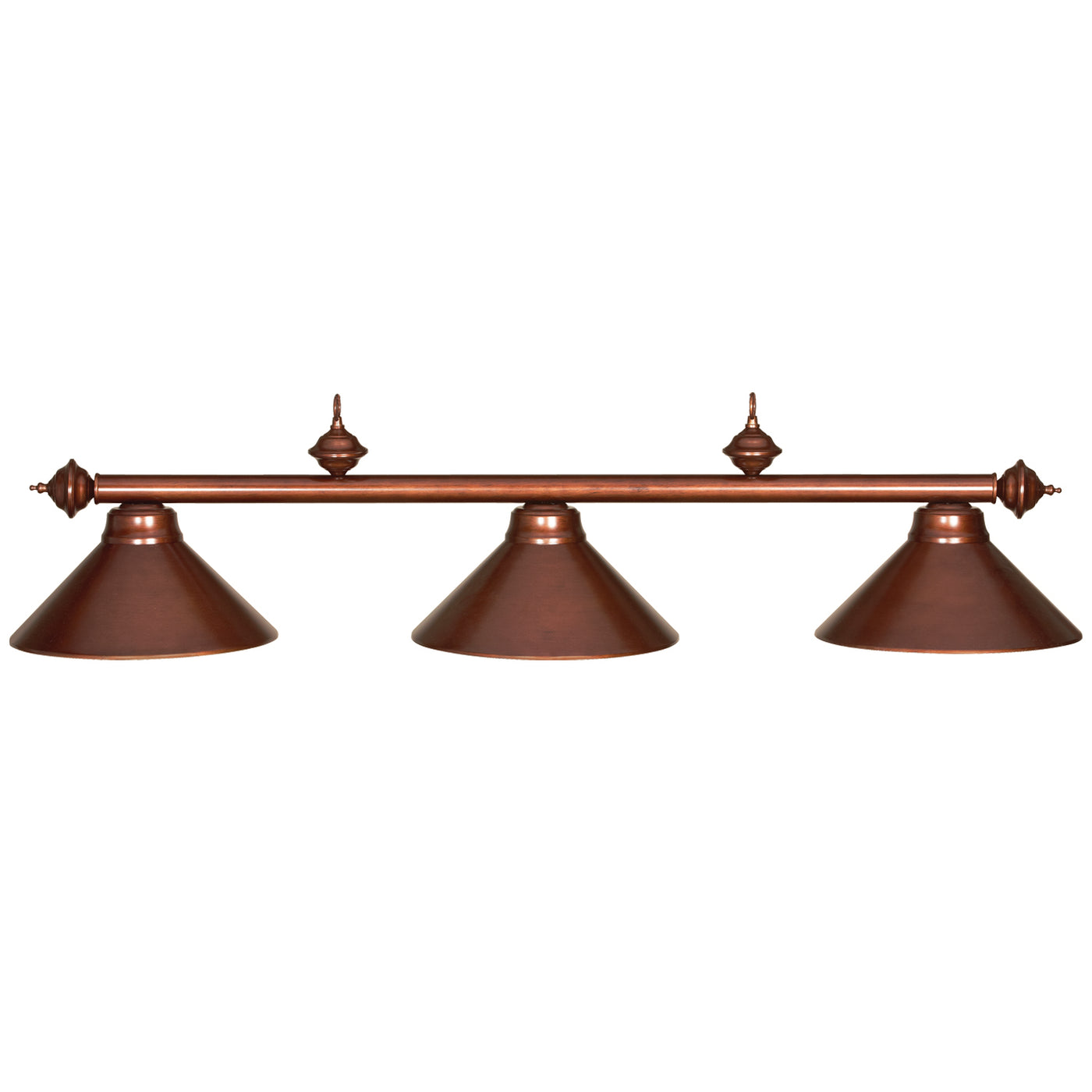 Classic and sophisticated, this 54 inch, 3-light metal billiards light fixture is exactly the upgrade your game room needs. Offering plentiful lighting for the home bar or for a pool table, this fixture features three metal cone shades to deliver directed illumination. Three foot chains on either side suspend this stylish fixture from the ceiling. The metal bar and shades feature matching finishes for a composed, elegant look. Made up of materials, Metal Bar, Metal Shades. Manufactured by RAM Game Room. Manufactured in Country of United States.
