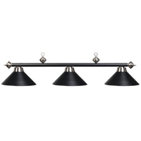 Classic and sophisticated, this 54 inch, 3-light metal billiards light fixture is exactly the upgrade your game room needs. Offering plentiful lighting for the home bar or for a pool table, this fixture features three metal cone shades to deliver directed illumination. Three foot chains on either side suspend this stylish fixture from the ceiling. The metal bar and shades feature matching finishes for a composed, elegant look. Made up of materials, Metal Bar, Metal Shades. Manufactured by RAM Game Room. Manufactured in Country of United States.