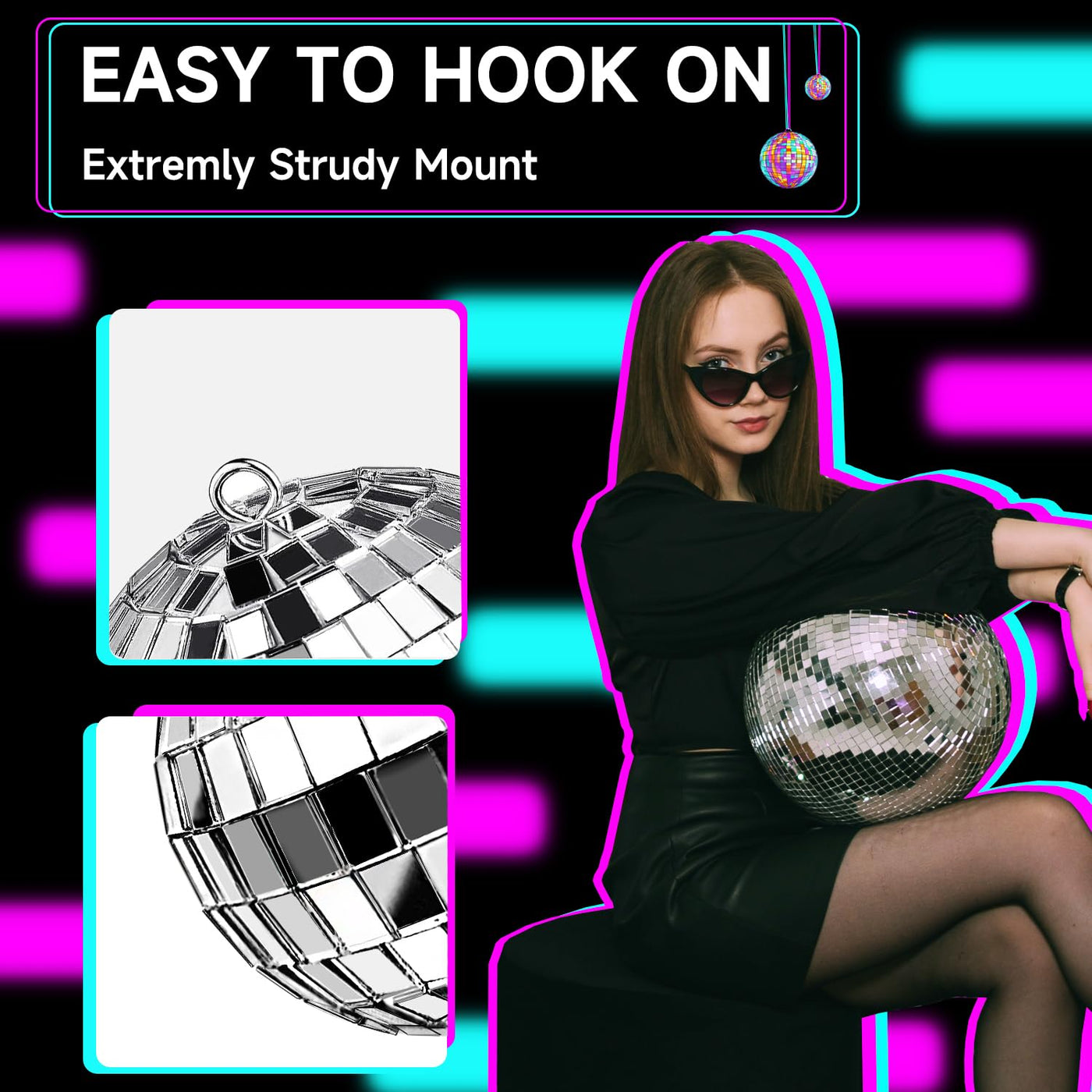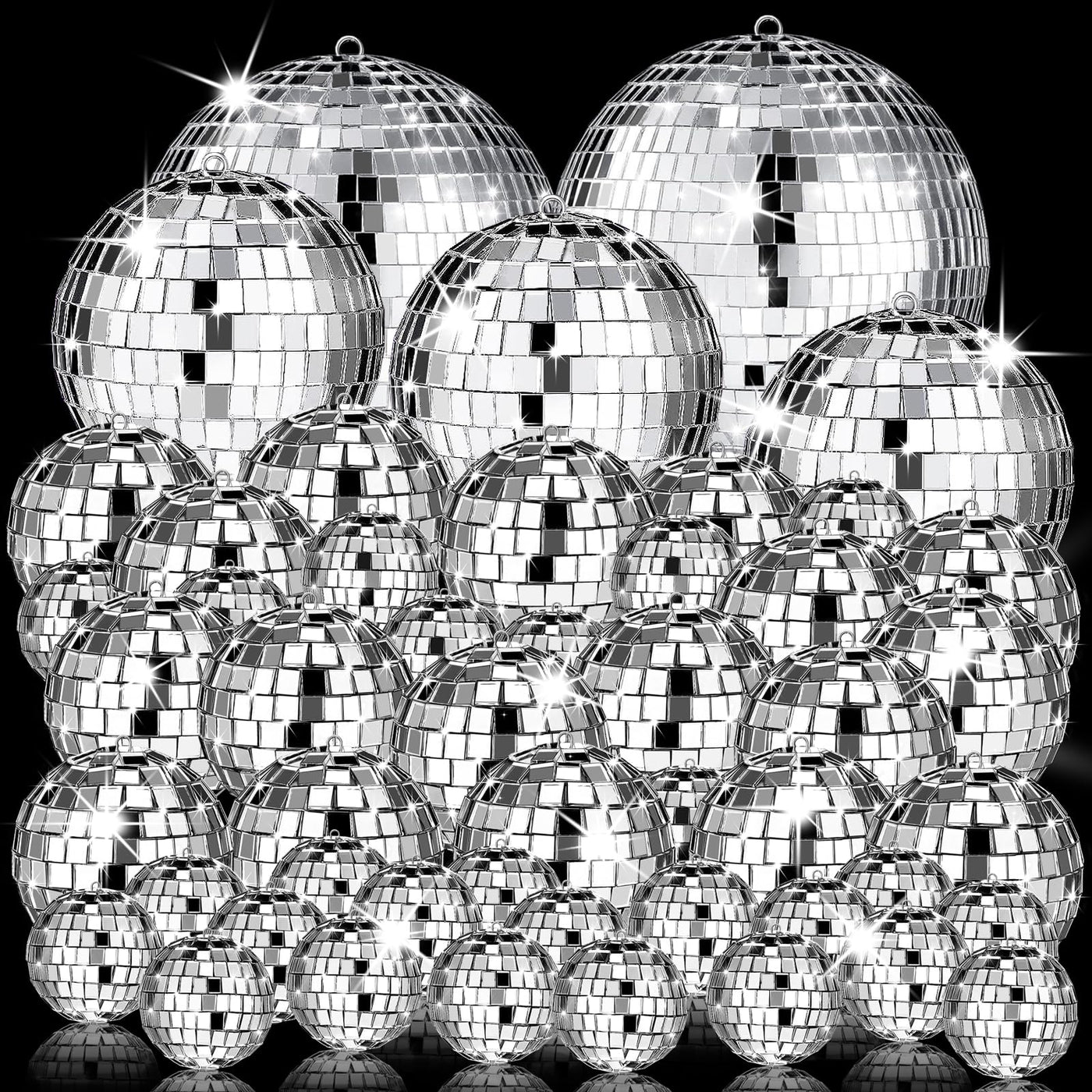 Disco ball is widely used as decorations on the 70s disco themed party, New Years Eve, Wedding, birthday, bridal shower and etc.This mirror ball reflects exquisite light on the walls or ceiling, making it a nice and personalized decoration. Super cute and shiny! Package comes with: 6 inch x 1 Pcs 3.2 inch x 4 Pcs 2 inch x 17 Pcs 1.2 inch x 32 Pcs A roll of crystal rope Available occasion: Disco ball party decorations Christmas decor Cake topper Disco inspired table settings Window decorations Please note: Manual measurement, there may be slight errors in size. Colors may vary slightly due to different screen displays.