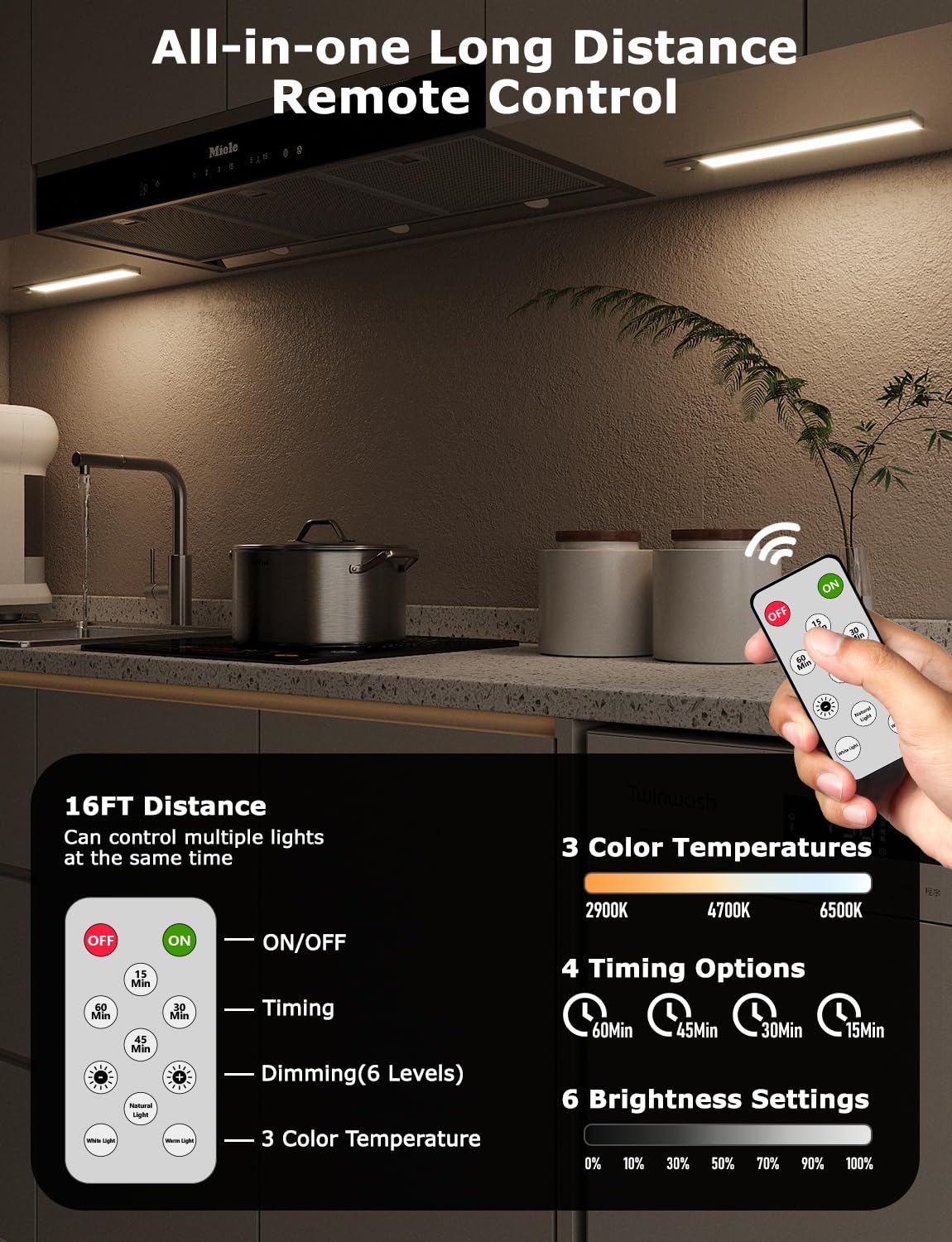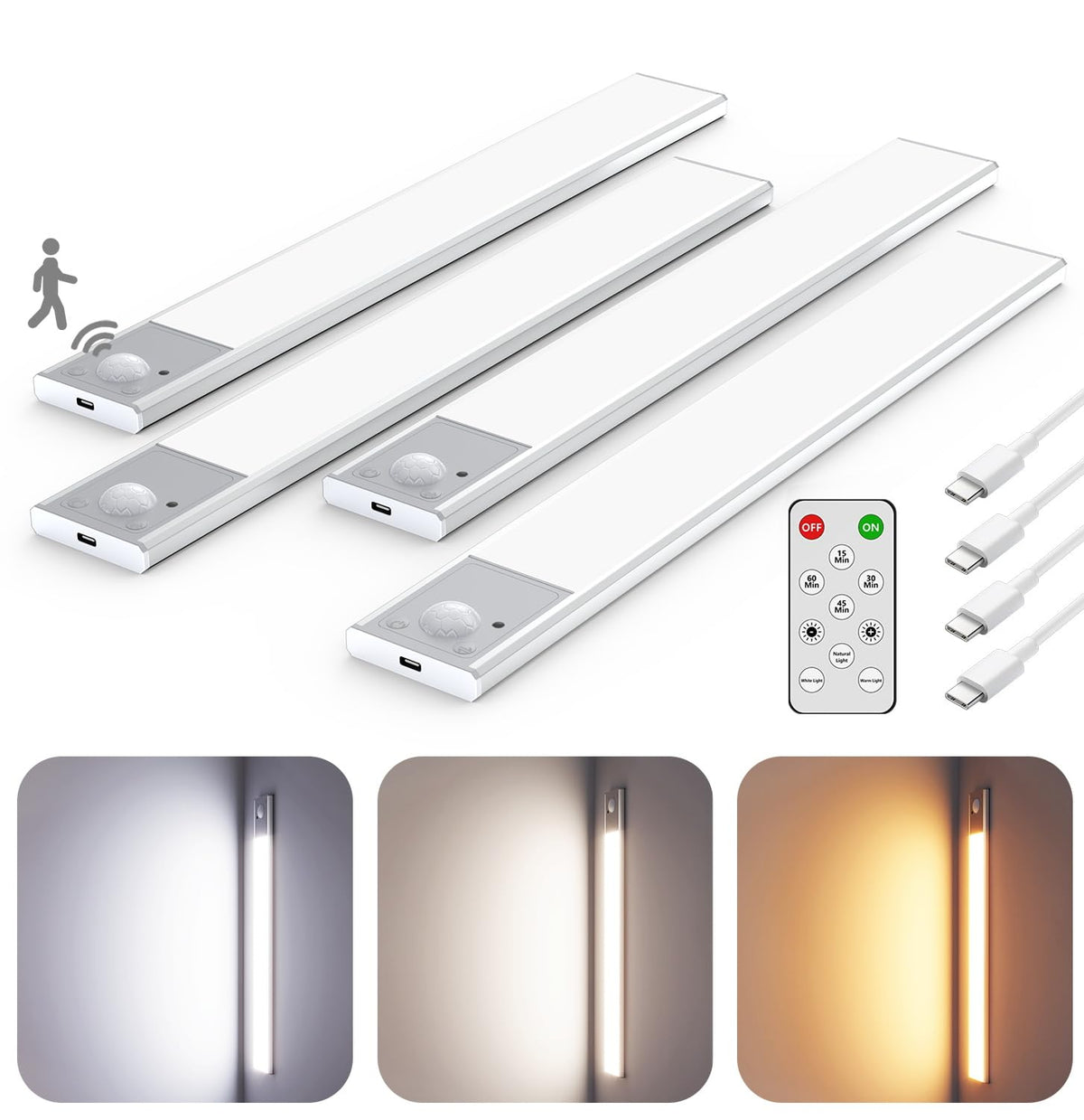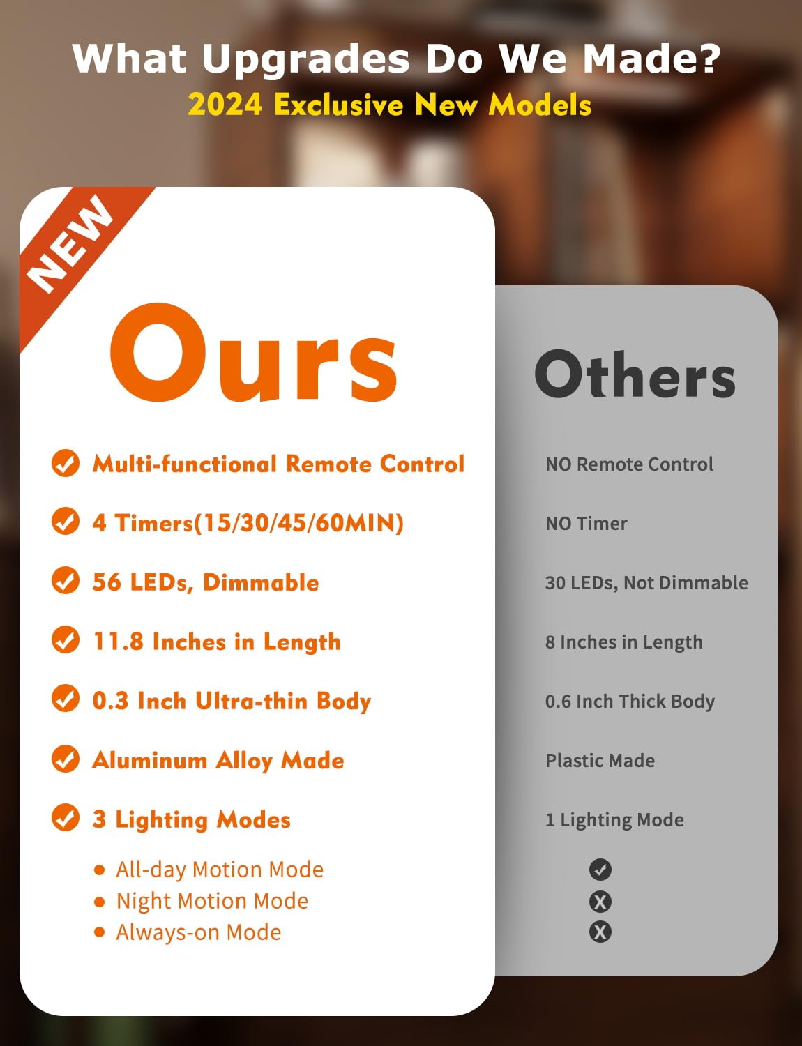 This is an innovative under cabinet led lighting. We have made the following upgrades after researching customer needs: ? Chose a 12-inch length with a wider range of use scenarios, an ultra-thin body of 0.33-inch, and a large 2000 mAh High-capacity battery (can be used for more than 30 days in sensor mode without charging). ? As for the material, we use a more rust-proof and durable aluminum alloy. ? Regarding function, we have added constant light mode and night mode to the ordinary motion detection mode and a 6-level brightness adjustment function. At the same time, we have added 4 timers. When the time is over, the led closet light will be turned off to save more power. ? In order to use the under counter lighting more conveniently, we have configured a remote control for you, which you can control within a range of 16ft. ? Each rechargeable under cabinet lighting is equipped with a USB C charging cable, allowing you to charge quickly.