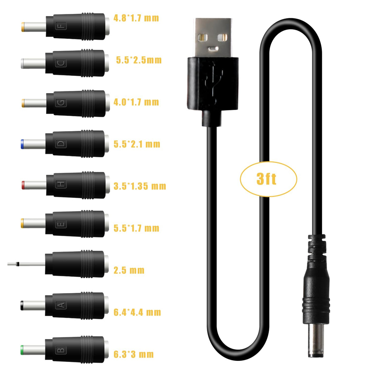 Q: What comes included in the package?A: The package includes 1x USB to DC 5.5*2.1mm jack charging cable and 9 DC plug connectors, which accommodate various devices. The connectors include sizes such as 6.4*4.4mm, 6.3*3.0mm, 5.5*2.5mm, 5.5*2.1mm, and several others, providing a comprehensive solution for multiple devices.