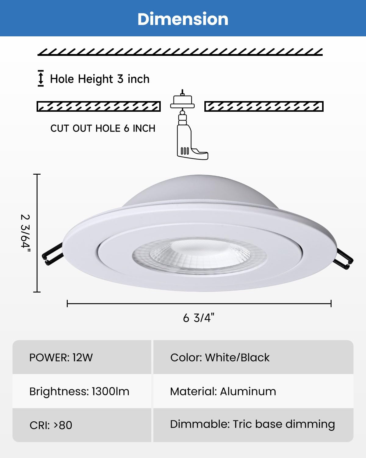 Q: Is this recessed light compatible with dimmer switches?A: Yes, the 6-Inch Gimbal Recessed Light is compatible with most dimmer switches, enabling you to adjust the brightness to suit different moods and activities.