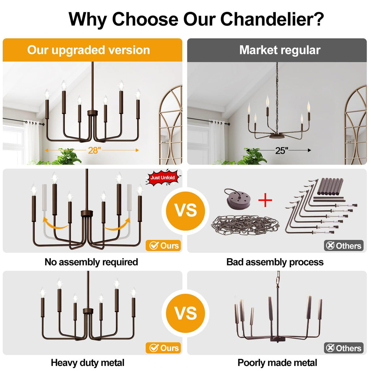 Q: What types of bulbs are compatible with the 6-Light Farmhouse Chandelier?A: The 6-Light Farmhouse Chandelier is compatible with various bulb types, including incandescent, LED, CFL, and halogen bulbs. Please note that bulbs are not included with the chandelier.