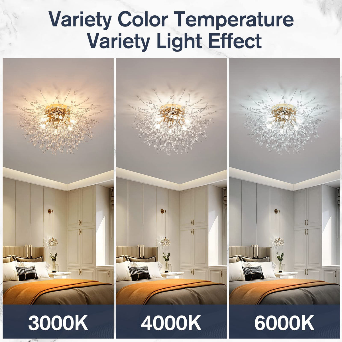 Unique Design & Modern Style: This semi flush mount ceiling light is designed with crystal firework shape, so elegant and gorgeous that adds a beautiful decor to your such place as bedroom living room foyer kitchen hallway closet farmhouse entry porch corridors, etc Also, it is bound to beat your expectation by practical value as well as aesthetic feeling Superior K9 crystal & Stainless Steel Material: This modern ceiling light is well-made of gold finish body with crystal beads, clear but glorious under lights WhatAs more, you wonAt need to worry about corrosion for totally anti-rust material, you can even unscrew the branches then wash them 6-Light Socket & Bulb RequirementsThe semi-flush mount hanging light is compatible with g9 based bulbs, including LED, cFL, incandescent and halogen bulbs It is also fully dimmable when used with a dimmable bulb and dimmer switch You can choose different style bulbs and color temperatures to create different atmospheres Note: The Bulb and Dimmer Switch Not Included] erfect Size & Wide ApplicationThe perfect size of W20 x H12 provides a great deal of ambient light without sacrificing too much space TheyAre especially beneficial in low-ceilinged spaces where pendants, chandeliers, or other hanging lights may pose the risk of head-bumps The upgraded ceiling lamp is a great choice for nearly any space such as hallway, entryway, living room, bedroom, basement, bathroom, kitchen, also perfect for commercial lighting in restaurants, cafes, shops, etc Easy to Install: This crystal ceiling light is extremely easy to assemble only by 3 steps described on the instruction But please just keep in mind that cut all plastic rings fixing on crystal strings in the last step