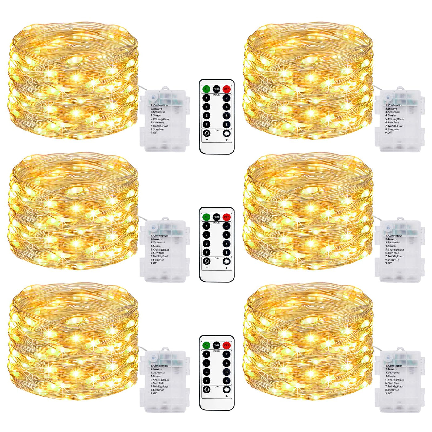 Specification: Quantity: 6 Pack Material: copper wire Color: warm white Rope length: 10M / 33FT Number of LEDs: 100 Power supply: 3*AA batteries (not included) The Package Includes: 6* 10m 100LED Light Chain 3*Remote Control 1*User Manual