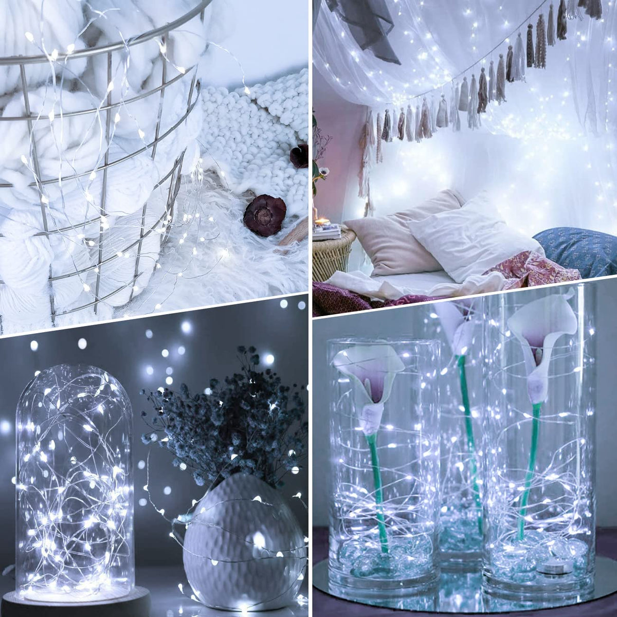 Q: How long are the fairy string lights and how many LEDs do they contain?A: Each string of the fairy lights is 33 feet (10 meters) long and contains 100 cool white LED bulbs.