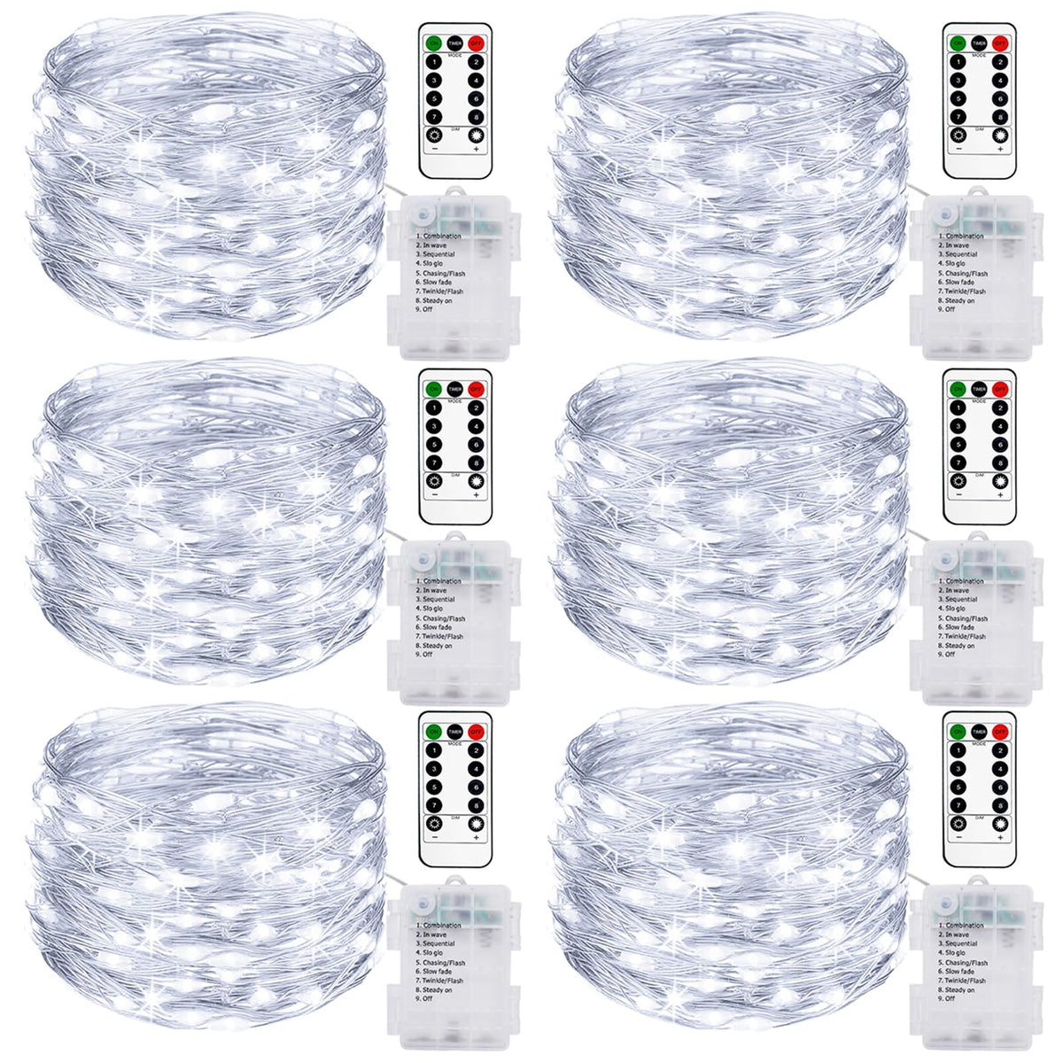 Specification: Quantity: 6 Pack Material: copper wire Color: cool white Rope length: 10M / 33FT Number of LEDs: 100 Power supply: 3*AA batteries (not included) The Package Includes: 6* 10m 100LED Light Chain 6*Remote Control 1*User Manual