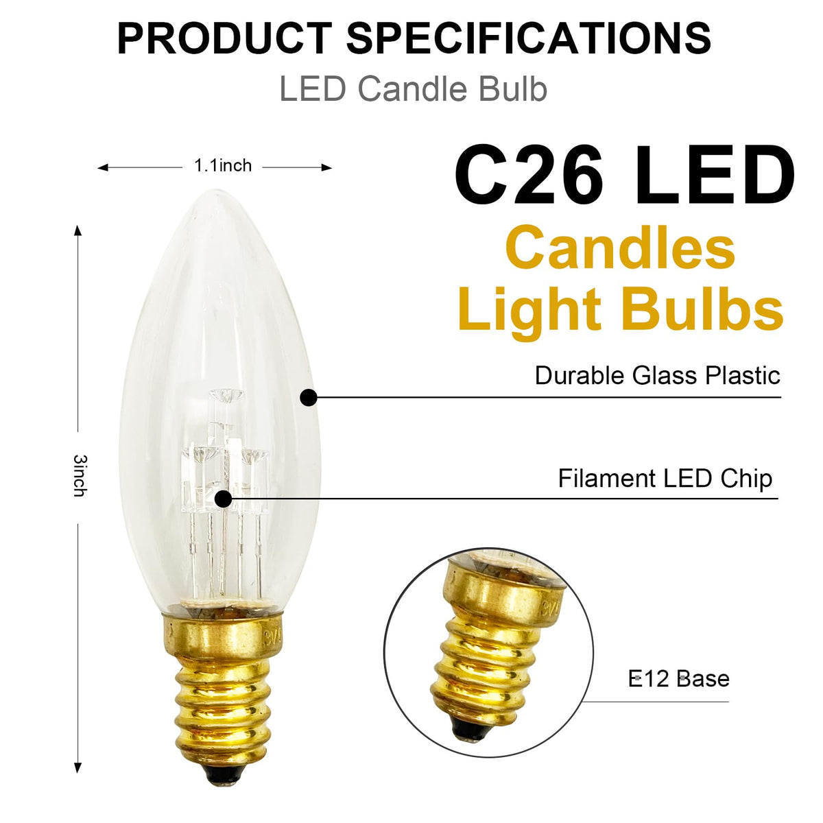 Shape:Clear Torpedo Tip Light Bulbs Bulb type: C26 LED Bulb Shade material: Glass Color: Warm white Bulb wattage: 0.12 W Volt: 3V Bulb holder model: E12.