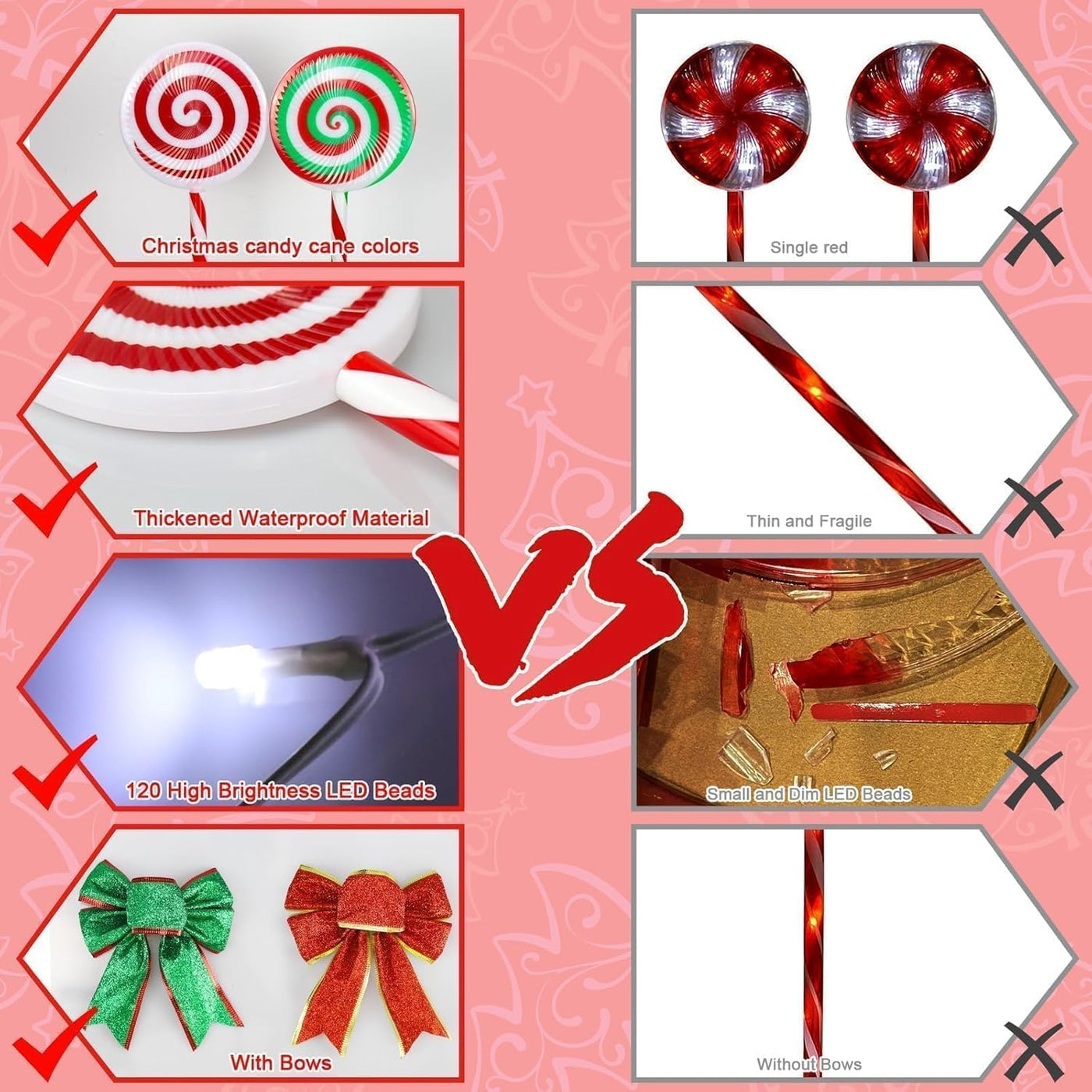 Q: What makes these lollipop lights a unique decoration choice for Christmas?A: These lights are crafted from upgraded thickened plastic, designed to be durable and resistant to breakage, while their realistic lollipop spiral shape adds a colorful and festive touch to your garden decor.
