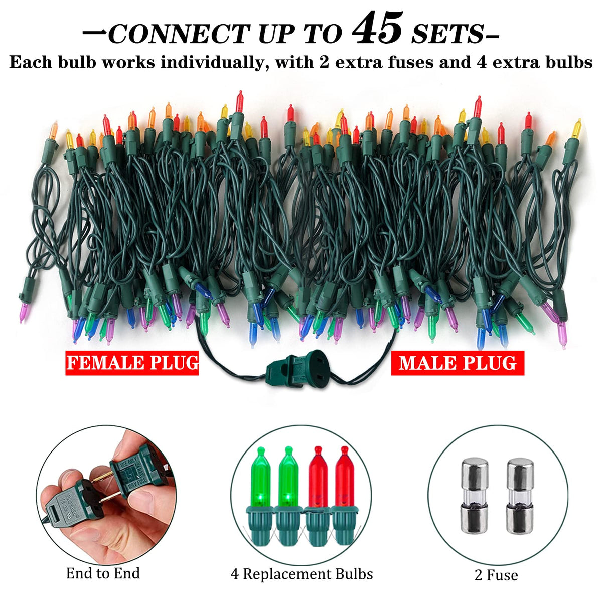 Q: Can I connect multiple sets of these Christmas lights together?A: Yes, you can connect up to 45 sets of these multicolor twinkling lights end to end, making them great for larger decorations.
